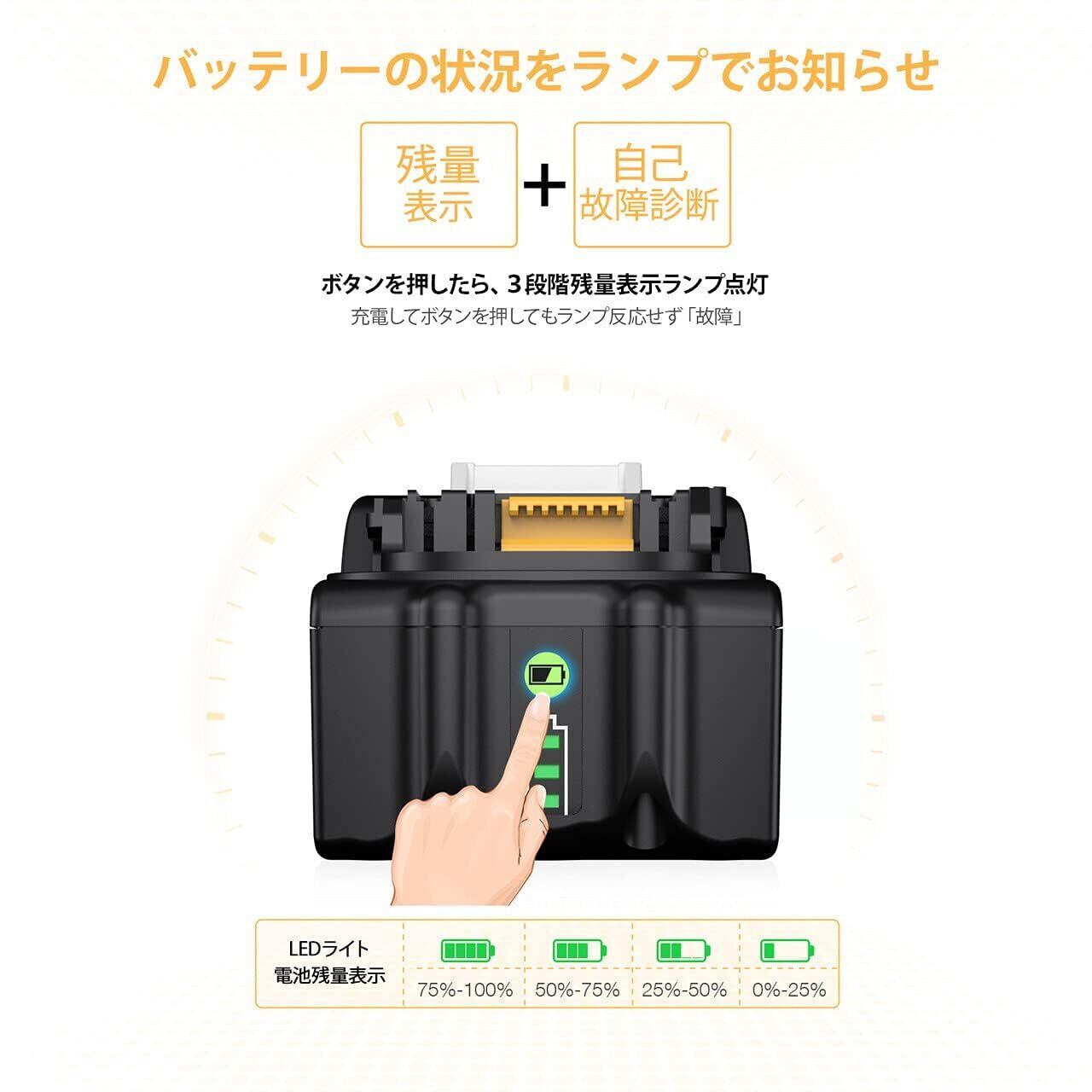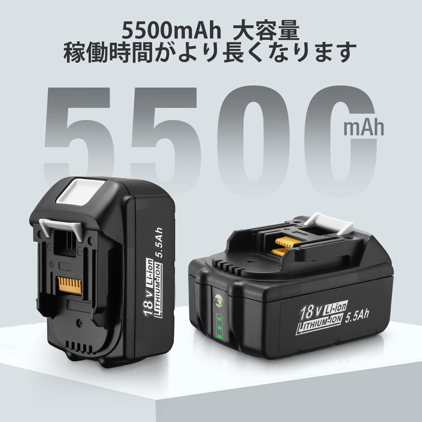【5.5Ah大容量・長時間稼働】: 5500mAhの大容量で、作業時間を大幅に延長。頻繁な充電の手間を省き、効率的な作業をサポートします。電動工具はもちろん、ハンディクリーナーなど、様々なマキタ18V対応製品でご利用いただけます。