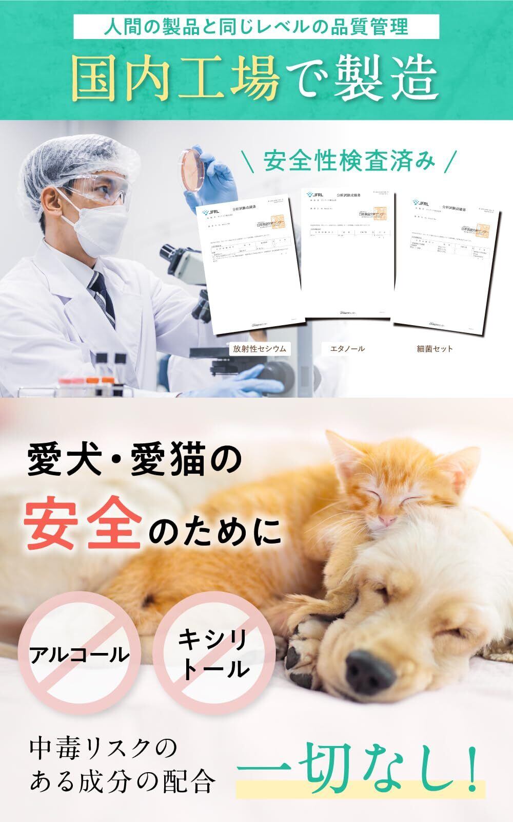 【14種の自然由来成分配合 】人間の美容や健康分野にも用いられる「ヒト幹細胞培養液」や、 「リベチン含有卵黄粉末」、「ナタマメ種子エキス」などの厳選した自然由来成分を14種配合。 大切なパートナーのストレスにならないように好みやすい味を徹底研究し、安全性・国内製造にこだわりました。