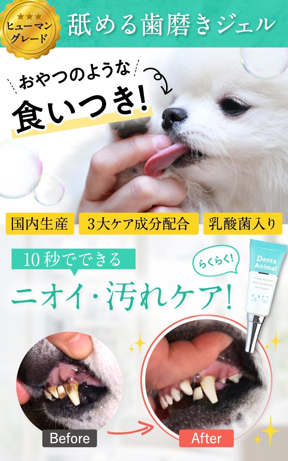 【大切なパートナーのために】デンタアニマルは 安心してお使いいただけるように私たち人間が口にするものと同じレベルの品質を目指して作られた ヒューマングレード(人間基準の安全性)の ペット用 歯磨きジェル です。