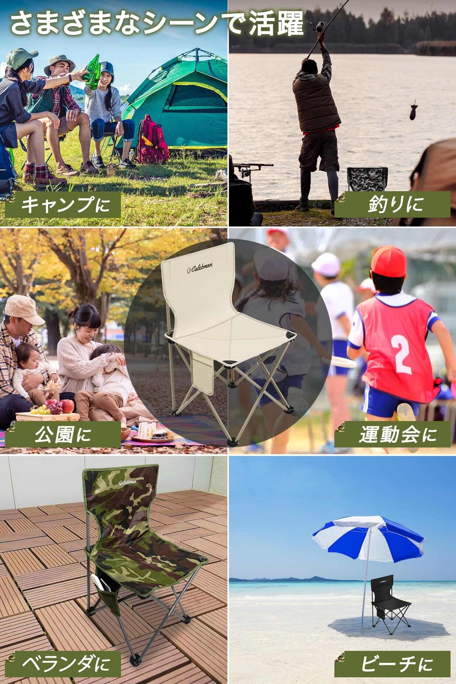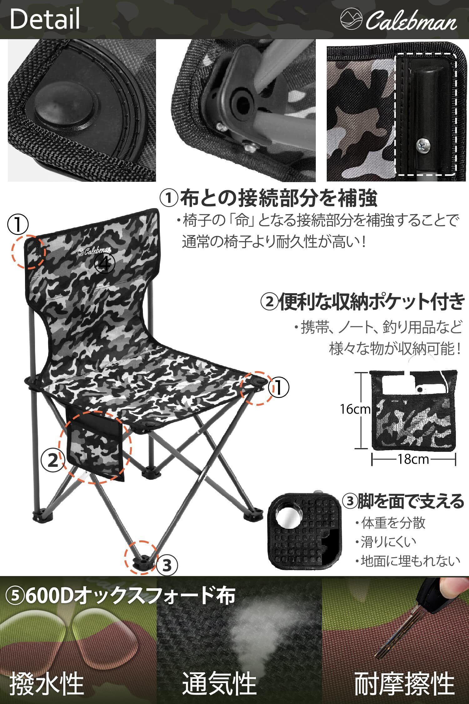 【商品仕様】○カラー:白黒迷彩、ベージュ、無地ブラック ○サイズ:縦39cm×横39cm×高さ65cm ○重量:1.25kg ○耐重量150kg ○素材:スチール、600Dオックスフォード生地 ○セット内容:背もたれ付アウトドアチェア、収納袋 ○用途:キャンプ、釣り、登山、BBQ、海、遠足、公園、テーマパーク、ベランダ、ガーデニング、行列の待ち時間用など ○ブランド:Calebman <安心の100日保証付>