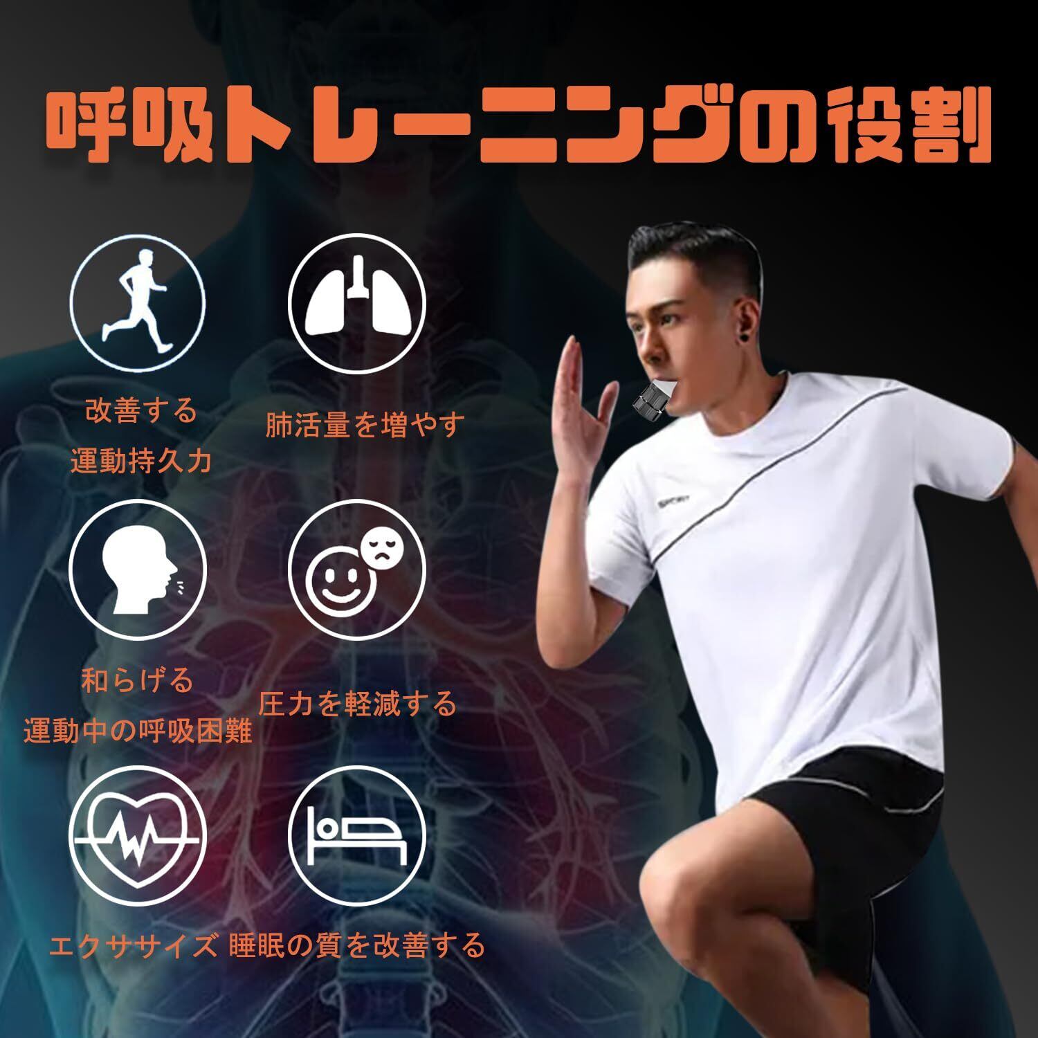 【呼吸筋トレーニング】:呼吸筋(横隔膜、補助関節など)を鍛えることができます。腹式呼吸をサポートするので、自然と腹式呼吸にフィットする。呼吸筋のトレーニングを続けると横隔膜の厚みが変わってきます。呼吸の質を高めることで、大量の酸素を筋肉に送り込むことができ、持久力を高めることができる。