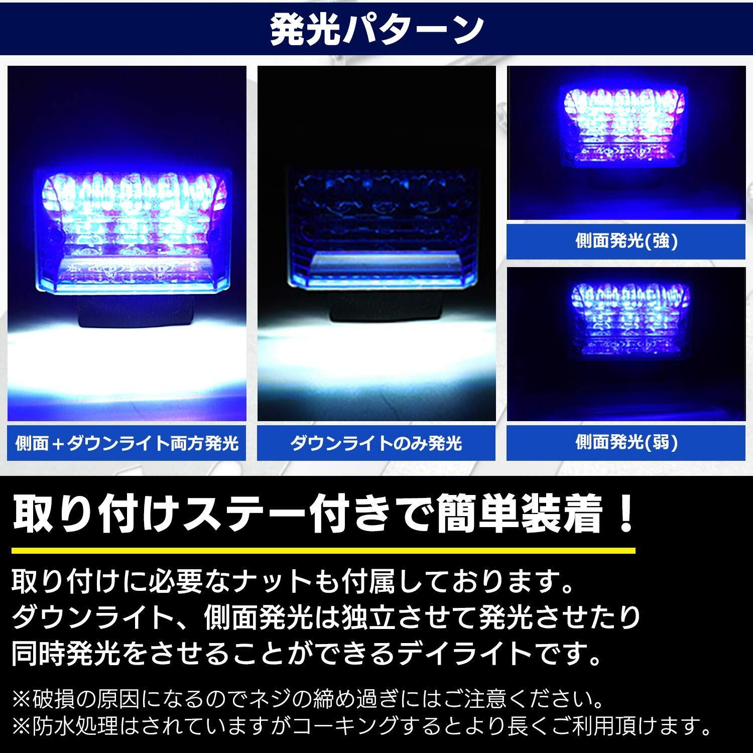 汎用タイプでダウンライト付き、デイライトとしてもご使用いただける高輝度(COB)LEDサイドマーカーになります! DC24Vに対応しているので大型車やトラックにも取り付けでき、明るいランプなので路肩灯や夜間の車幅確認で大活躍です! カラーバリエーションも豊富なのでトラック、ローリー、トレーラー、バス、デコトラなど様々な車種のカスタムやドレスアップ用の社外アイテムとしてもオススメです。 防水処理はされていますがコーキングするとより長くご利用頂けます。 ※破損の原因になるのでネジの締め過ぎにはご注意ください。 【配線】 黒=アース 赤=ダウンライト (ホワイト) 白=弱点灯 (ブルー) 黄=強点灯 (ブルー) ダウンライト、 側面発光は独立させて発光させたり同時発光をさせることができます! ※配線が3色の場合は、黒=アース、黄=ダウンライト、赤=サイドマーカー、になります。 【付属品】 本体、 取付けステー、ボルト、ナット ※10個セットと4個セットをご用意しているので、ご希望の個数をバリエーションからお選びください。 【側面発光カラー】 ホワイト(クリア)/オレンジ/ブルー/グリーン ※アンダー(ダウン)ライトはホワイトになります。