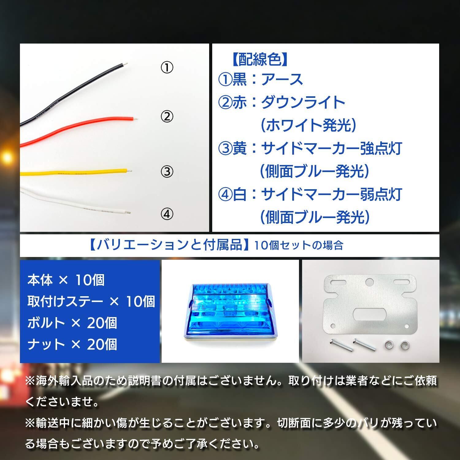 【付属品】 本体、 取付けステー、ボルト、ナット ※10個セットと4個セットをご用意しているので、ご希望の個数をバリエーションからお選びください。 【側面発光カラー】ホワイト(クリア)/オレンジ/ブルー/グリーン ※アンダー(ダウン)ライトはホワイトになります。