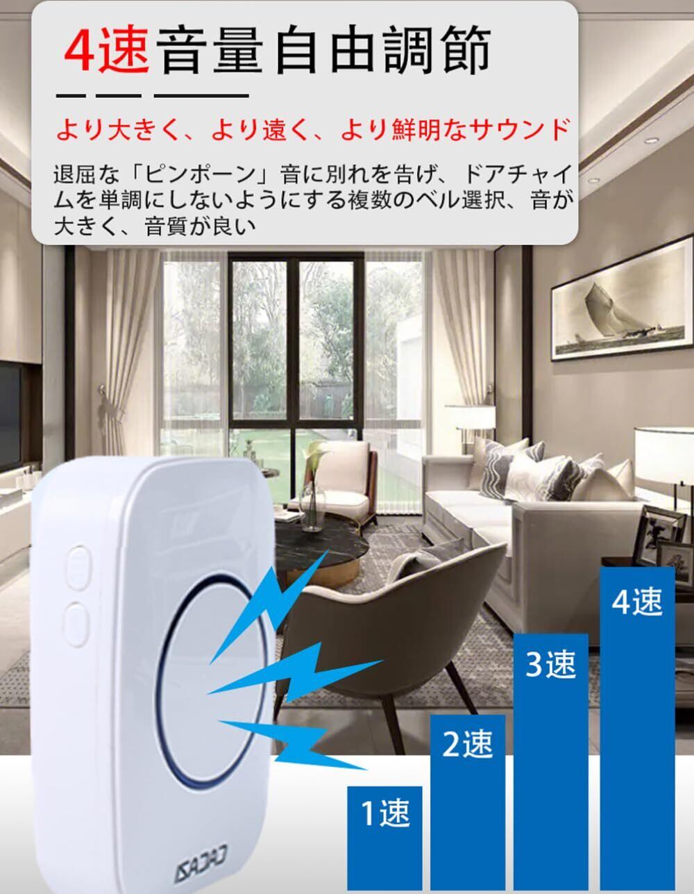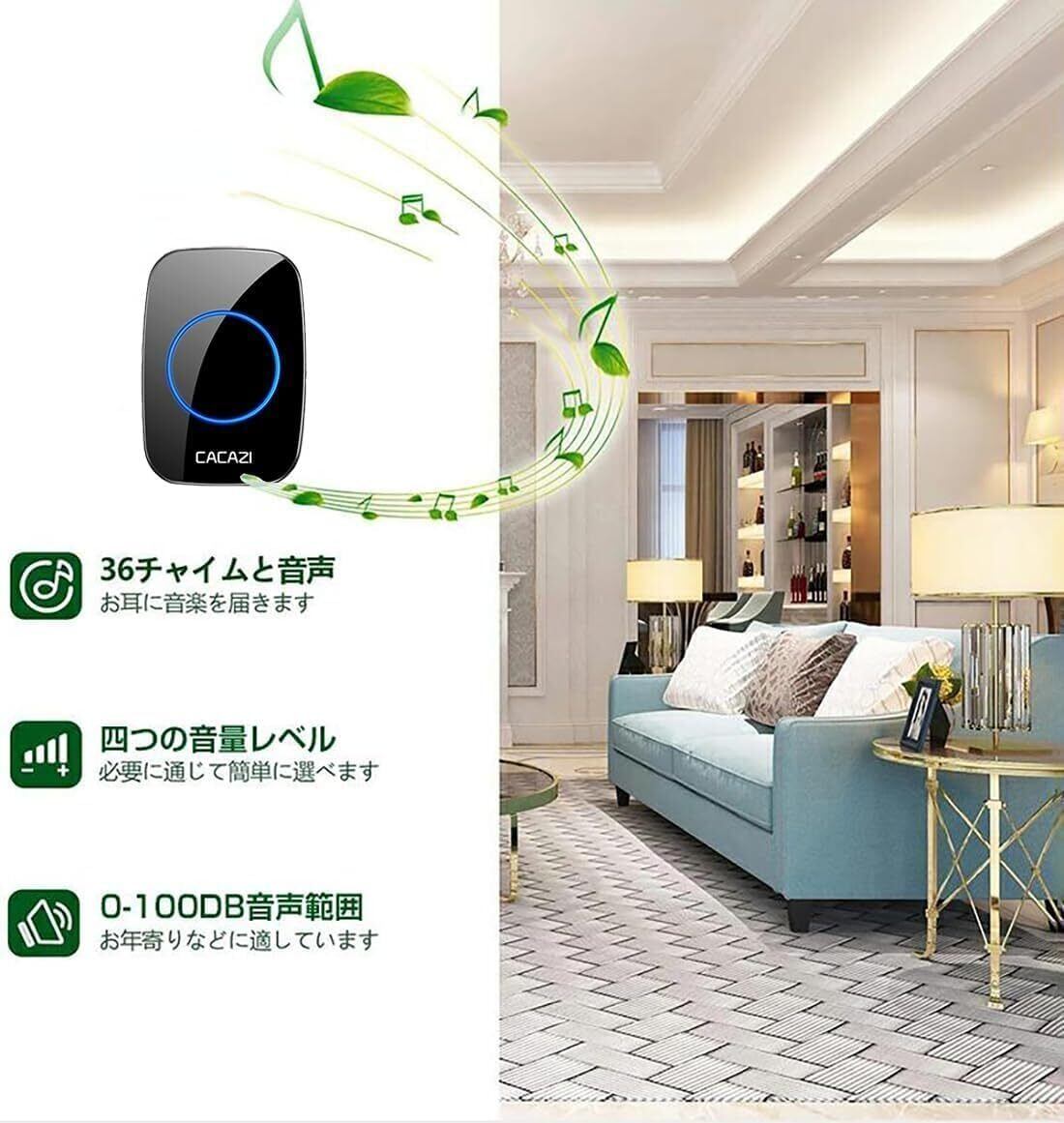 【音量調整&36曲メロディー】:こちらのワイヤレスチャイムは大音量呼び出し音で、音量4段階調節でき、ボリュ—ム可変範囲は0dB~100dBです。36曲メロディーが選択可能で多種多様の環境と要求を満たされます。大音量で聴力弱い方にもお勧めします。