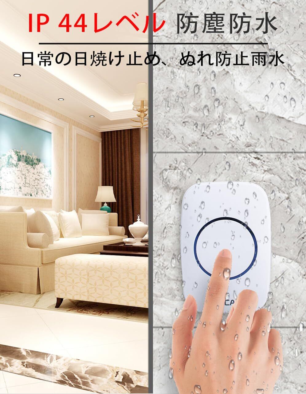【IP44生活防水】:こちらの呼び出しチャイムの押しボタン送信機は防滴仕様(防水規格IP44相当)なので、防水・防塵性能が優れており、屋外や風呂場でも使用でき、雨の日でも心配ありません。ただ水に浸けて使用することや大雨がかかる場所をお避けください。