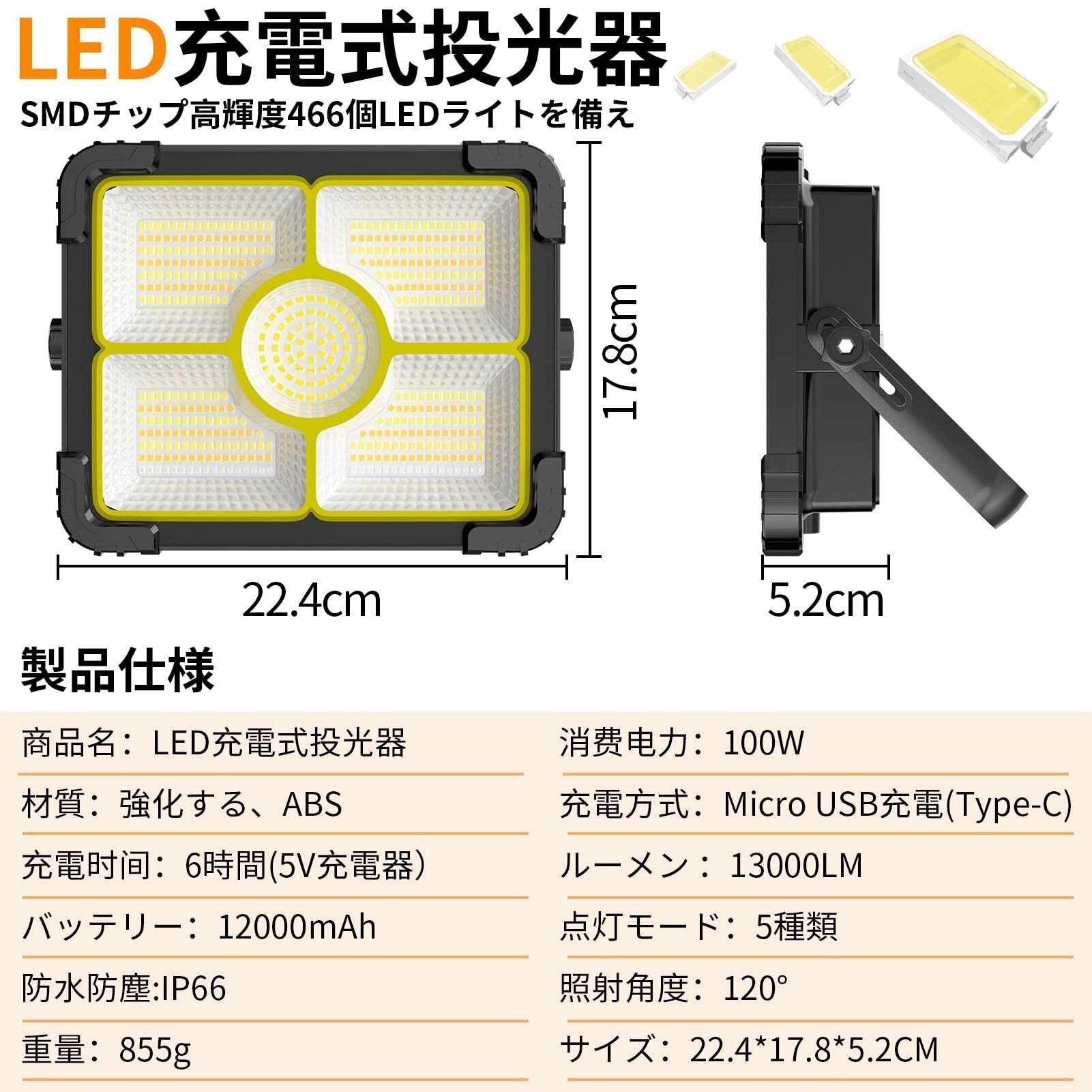 LED投光器 充電式 作業灯 投光器 led 屋外 12000mAH大容量 【超高輝型466個LEDチップ】 ledライト 集魚灯 充電式 100W 13000LM ソーラー充電/Type-c充電 屋外投光器便携式 5色切替 太陽光発電 IP66防水 磁気設計 アウトドア キャンプ 夜釣り登山 防災 緊急 夜間工事 停電対応 地震対策 車の修理 PSE認証済み…