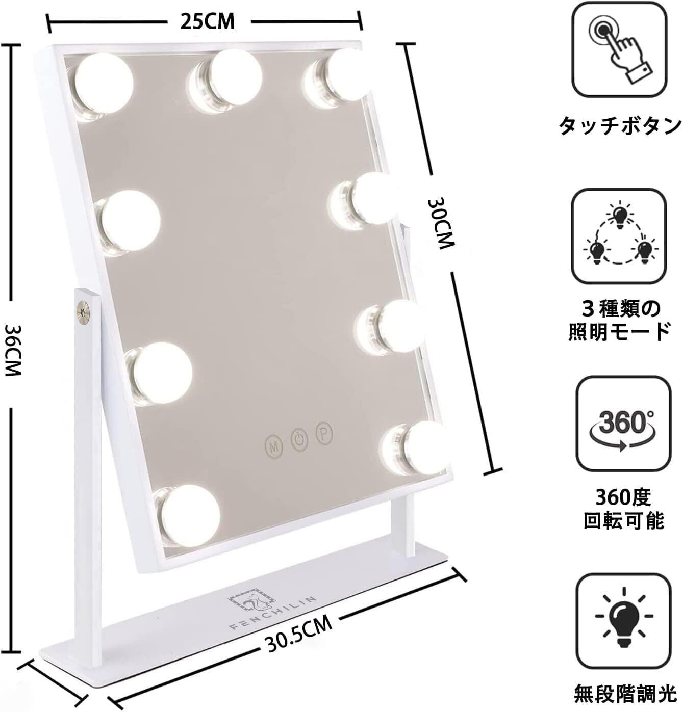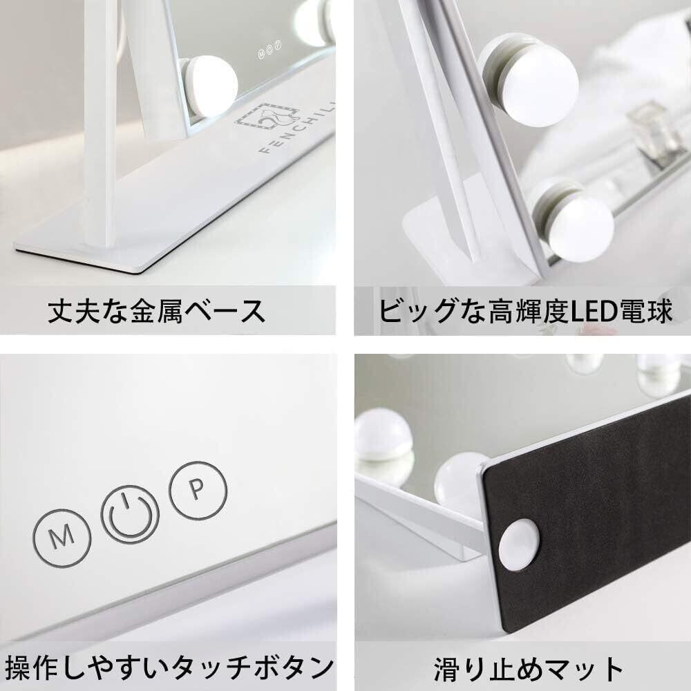 FENCHILIN 女優ミラー 卓上鏡 ハリウッドミラー 9個LED電球付き 10倍拡大鏡付き 三色照明モード 明るさ調節可能 360度回転 給電式(ホワイト)