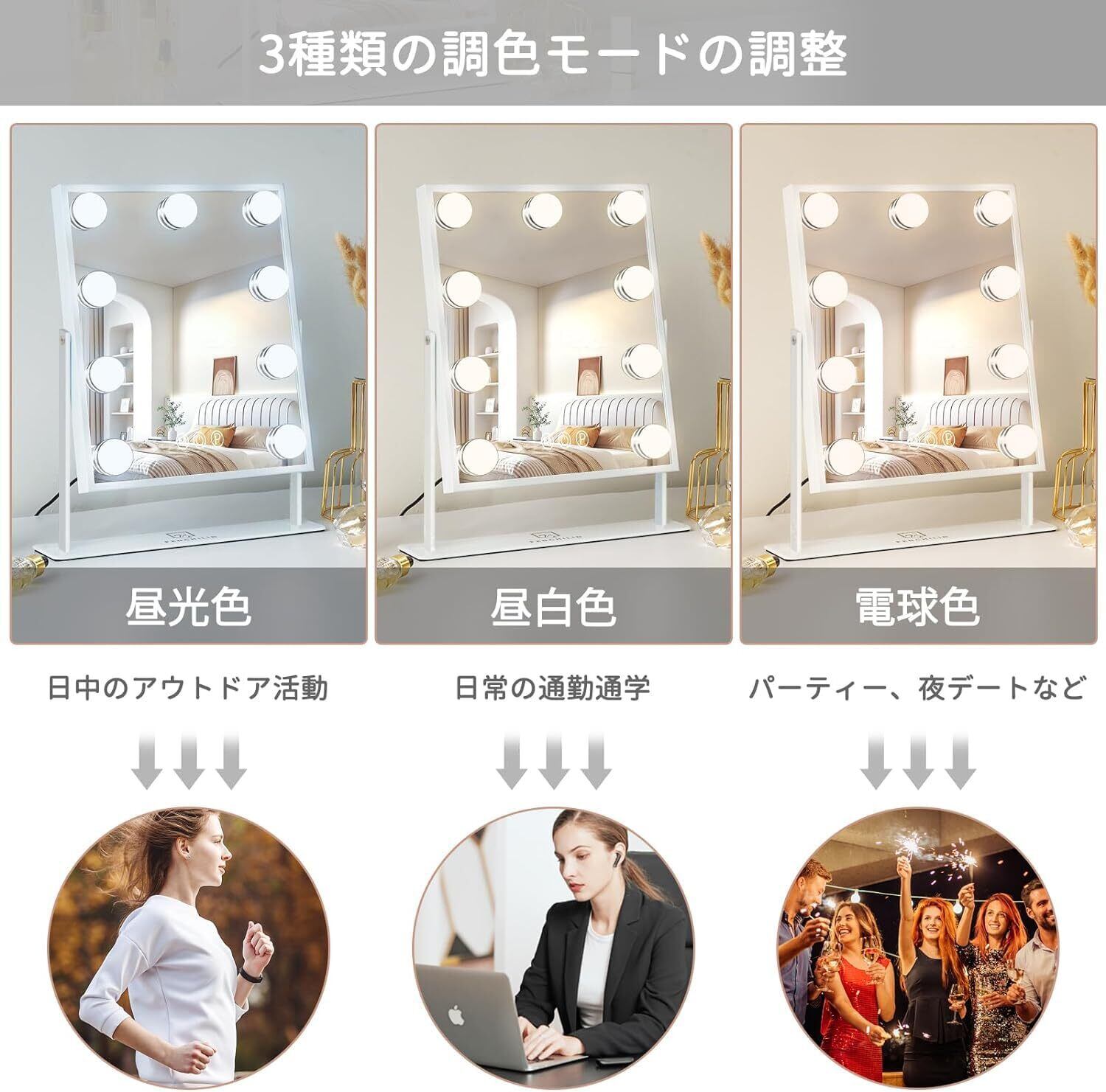 3種類の調色モード・無段階調光:付属の電源アダプターで給電するライト付きミラーです。スマートなタッチパネルで電源のオン/オフができ、楽々、簡単操作できます。3色LEDライト搭載されて、「M」を押すと、穏やかなウォームライト(電球色)と太陽光に近い自然なナチュラルライト(昼白色)と清々しい爽やかなクールライト(昼光色)3種類の調色モードを選択できます。また、「P」を長押しすると、明るさを無段階調整することができます。朝方・夜など暗い時間帯でも洗面所やトイレなど暗い場所でも、本当の自分を映し、ムラなく顔全体を均一に照らし、ナチュラルなメイクができます。