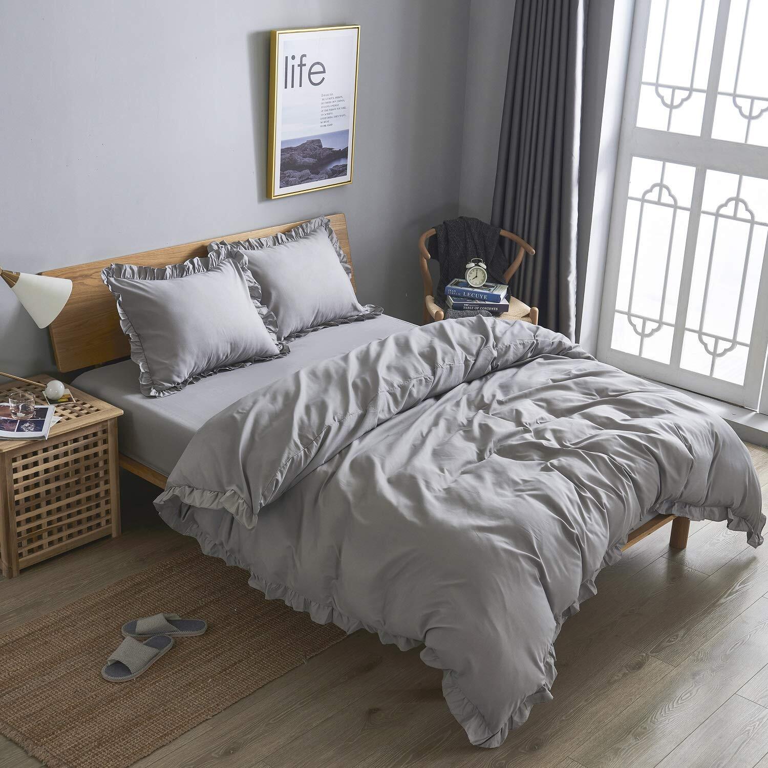 HOdo Home 布団カバー シングル 3点セット 掛け布団カバー ベッドカバー 枕カバー ベッドシーツ ボックスシーツ 洋式・和式兼用 寝具カバーセット フリル付き ピーチスキン加工 洗い替え 速乾(ライトグレー)