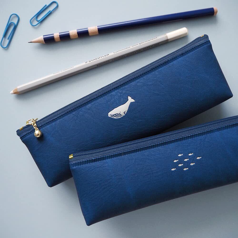 モチーフは両面箔押し、ファスナーの歯が本体生地と同色の樹脂ファスナー。1色ペンなら10本くらい入る細めのマチありタイプです。