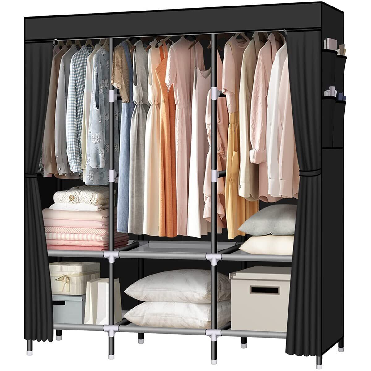 【特価商品】ワードローブ カバー付き クローゼット 不織布 大容量 ハンガーラック カバー付き シンプル収納棚 おしゃれ 組み立て式 省スペース 洋服収納ラック衣類収納ラック 防水 防塵 防汚 耐用 幅 125×奥行44×高さ172cm (ブラック)