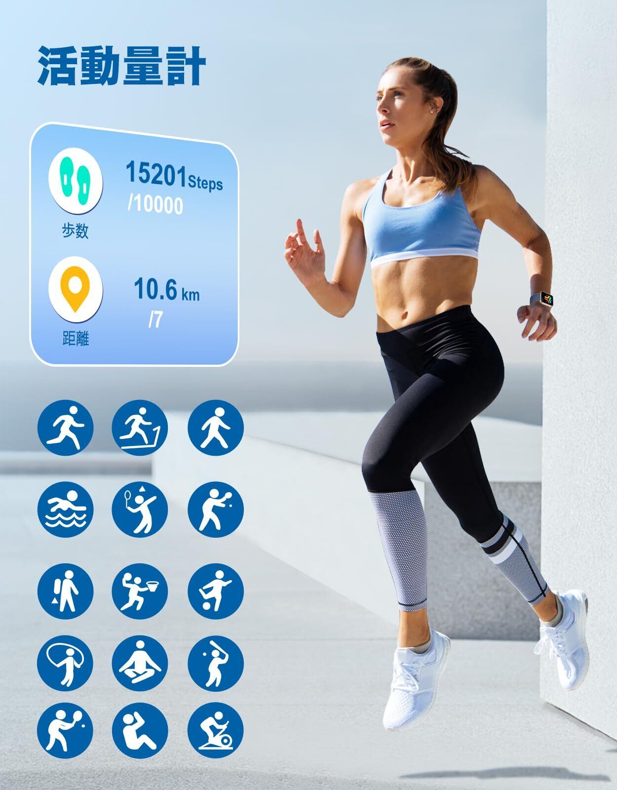 【活動量計&日常生活管理&IP68級の防水】日常生活や様々なスポーツ、フィットネス活動において、スマートウォッチの革新モデルは歩数、距離など様々なスポーツデータを記録することができます。ランニング、ウォーキング、サッカー、水泳、ヨガなど、アプリには100種類以上の運動モードがあり、多様な運動ニーズに応え、運動管理をサポートします!スマートウォッチは手首に装着することができ、軽量設計と通気性の良いベルドにより、一日中装着していても負担なく身体の状態を把握することができます。、女性のニーズに合わせて生理周期の機能も搭載しています。日常生活に大きな利便性をもたらし、幸福感をもたらす!IP68の防水性を備えているので、日常生活の手洗いや洗顔の際はもちろん、夏に汗だくのトレーニングにも気にせずに使用OK です。※ご注意:お風呂、サウナ、温泉水や温泉の湯気及び高い水圧は故障の原因となります。