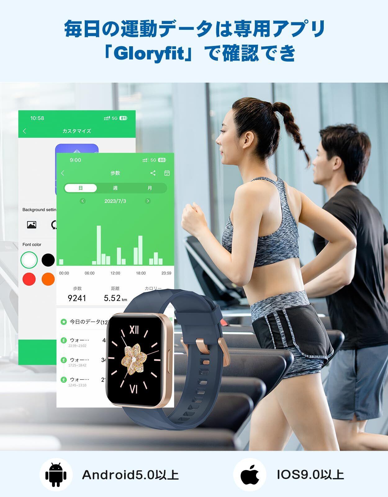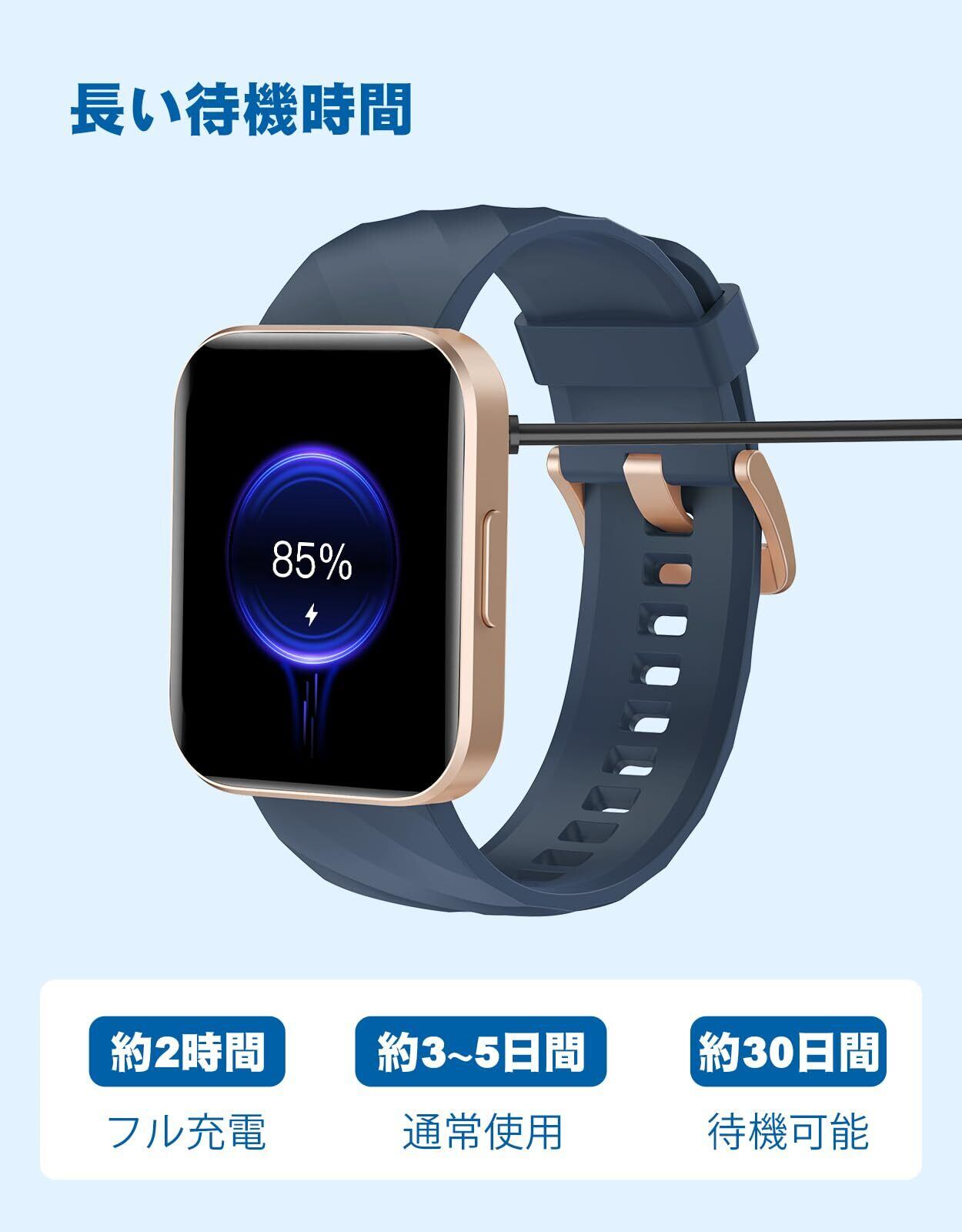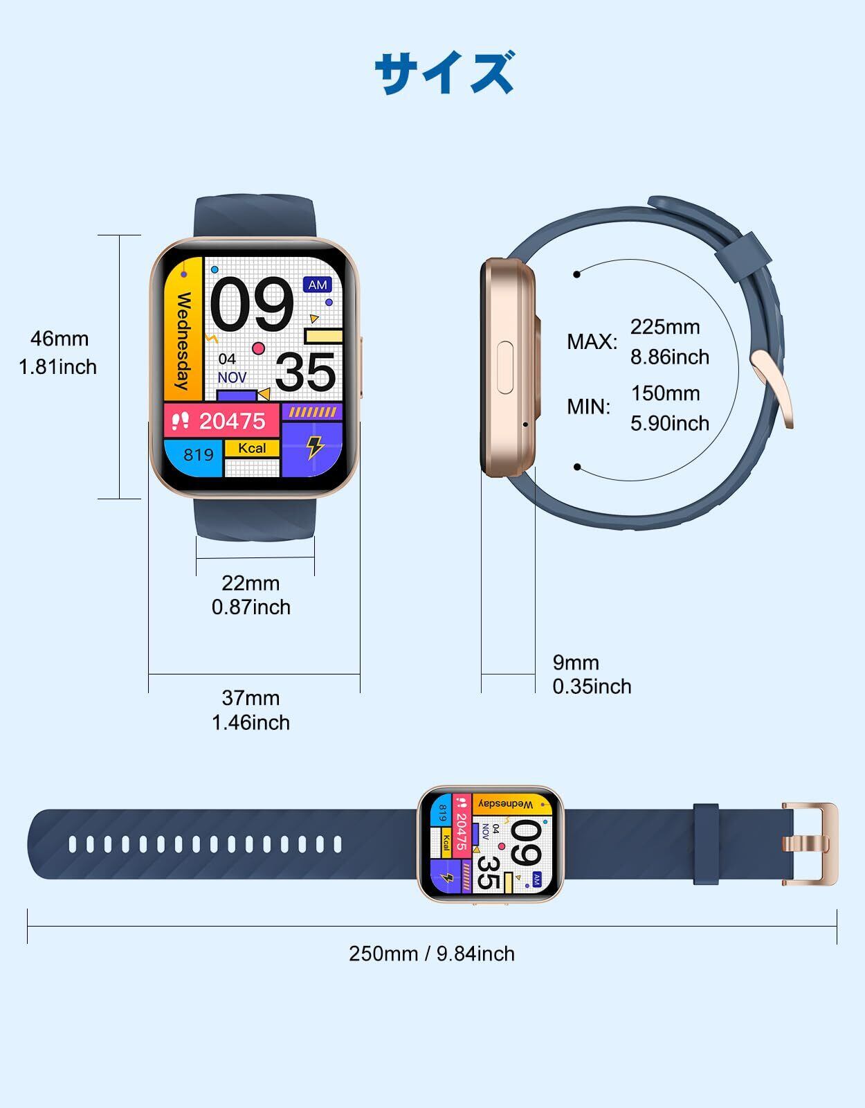 【大容量バッテリー&便利な機能満載】長い持ちのバッテリー搭載され、一回フル充電、3~5日間の連続使用も問題なく、待機時間は約30日間です。頻繁に充電する手間が省けます。付属の磁気充電ケーブルをスマートウォッチの充電端子に接続すると充電開始となります(実際の使用状況や環境によって電量持ち時間が異なります)通知やBluebooth通話などの基本的なスマートウォッチ機能に加え、例えば、音声アシスタント、おやすみモード、携帯検索、天気予報、懐中電灯、電卓、ゲーム、目覚まし時計、ストップウォッチ、SOSなど、日常生活をより快適にする機能が搭載されています。また遠隔操作もお任せください。ios9.0以上、android5.0以上のスマホに対応可能、さまざまシーンで使用できます!レディースでも、メンズでも、幅広い方にお使いいただけます。敬老の日、誕生日、父の日、母の日、新年、 クリスマスなどに適用なプレゼントとなります。