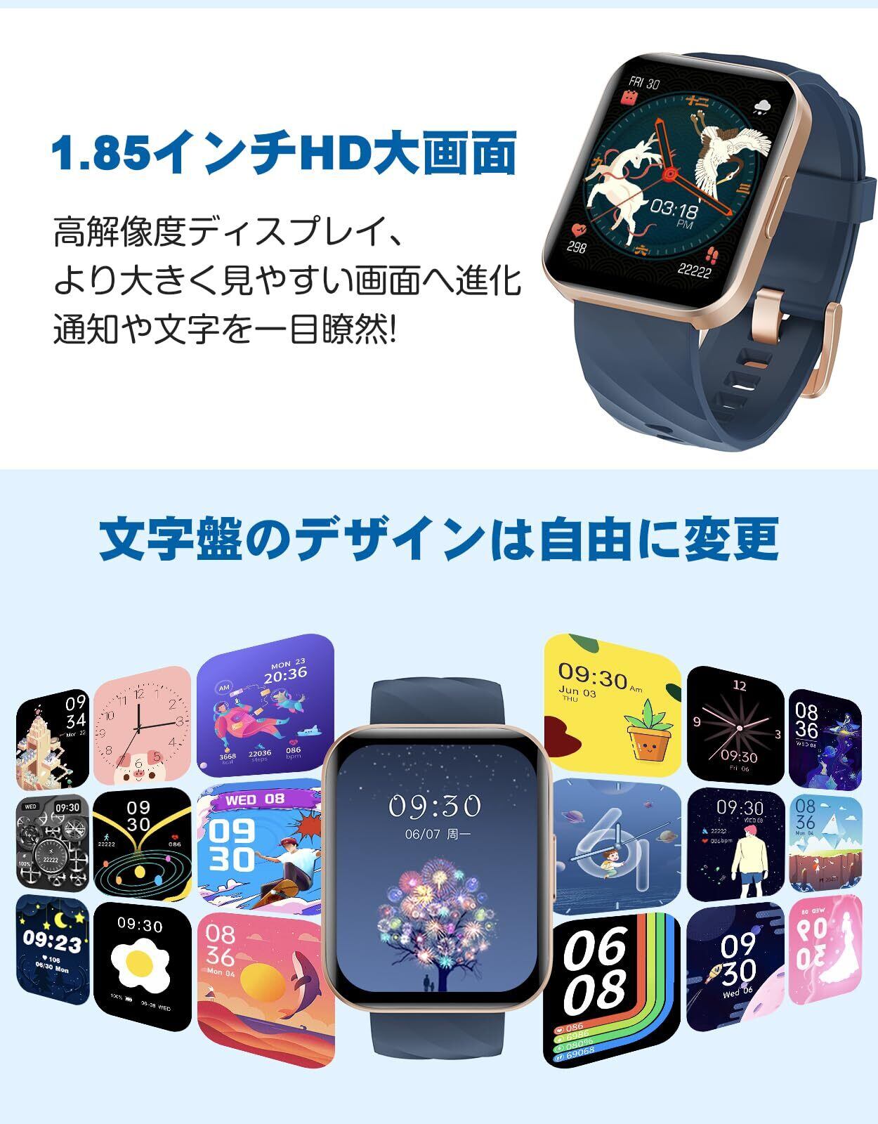 RUIMEN スマートウォッチ iPhone アンドロイド 対応 通話機能付き Smart Watch 1.85インチ大画面 レディース メンズ 腕時計 100+種類運動モード ゲーム 生理周期管理 Gmail/着信&メッセージ通知 スマホ探す 天気予報 音楽制御 長持ちバッテリー ストップウォッチ 目覚まし時計 技適認証済み