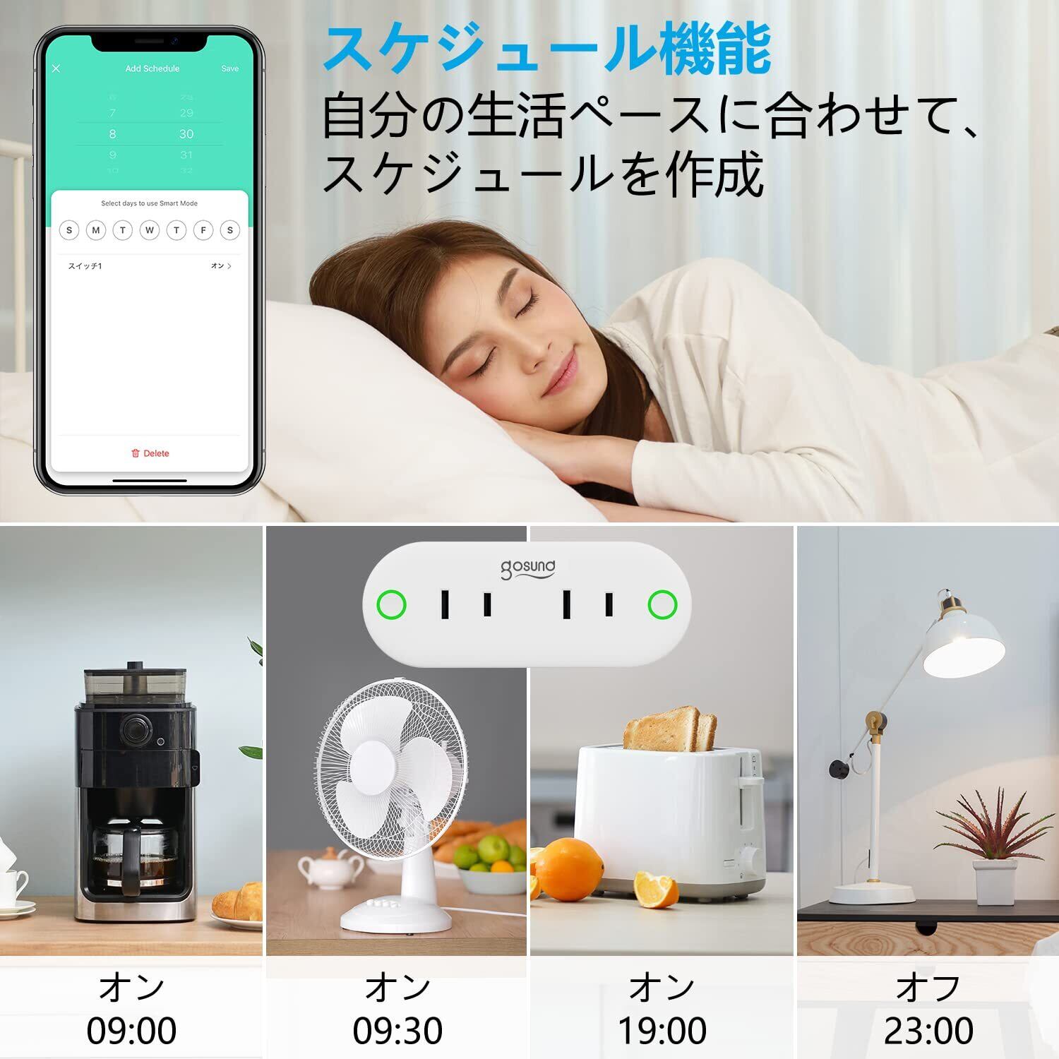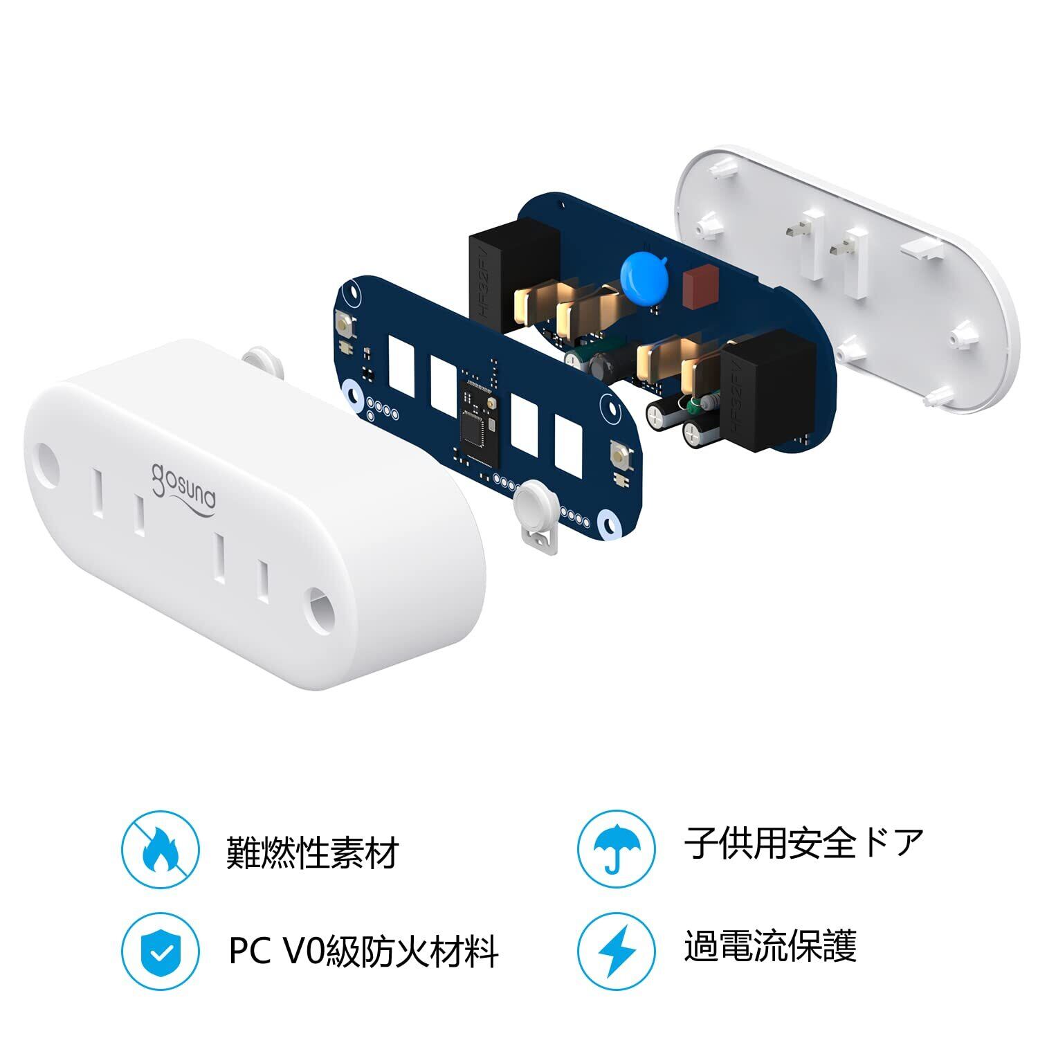 【アプリで操作】Gosundスマートプラグは、どこからでも家電製品をコントロールすることができる。自宅にいなくても、携帯が安全な2.4 GHz Wi-Fiネットワークにアクセスしている限り、Gosundアプリを介してWi-Fiコンセントを直接制御することもできる。電気の消し忘れも心配する必要がない。【スケジュール・タイマー設定】ご家庭のスマートwifi電源プラグのスケジュールとタイマーを設定することで、事前に夕食を用意して家に帰ることができる。スマートホームを所有する準備をし、カスタマイズされたスケジュールを作成し、ライト、扇風機、加湿器などの家電製品を自動的にオン/オフにする。【音声コントロール】AlexaまたはGoogle Asistantに音声で指示を出せば、スマートプラグで家庭用電気製品を制御できる。両手がふさがっていても、声だけでコントロール可能である。【コンパクトデザイン】すっきりとしたデザインのため、上下のコンセントの邪魔をしないし、横並びACポート2個口があるため利便性アップ! 【安全で信頼できる】スマートプラグは、V-0難燃級の熱可塑性プラスチック、純銅の接続部品と先進的なPCBAなどのプレミアム素材と技術を採用しており、火災の危険を回避し、過負荷保護を提供して家族の安全を守ります。【簡単で便利なセットアップ】スマートコンセントを壁に差し込むだけで、Wi-Fiネットワーク(2.4 Ghzのみ)を通じてインターネットに接続できます。ハブ不要です。【安心保証】 保証期間1年。ご購入いただいた商品に何か問題がございましたら、無償交換・返品・返金を対応致しますので、お気軽にご連絡ください。