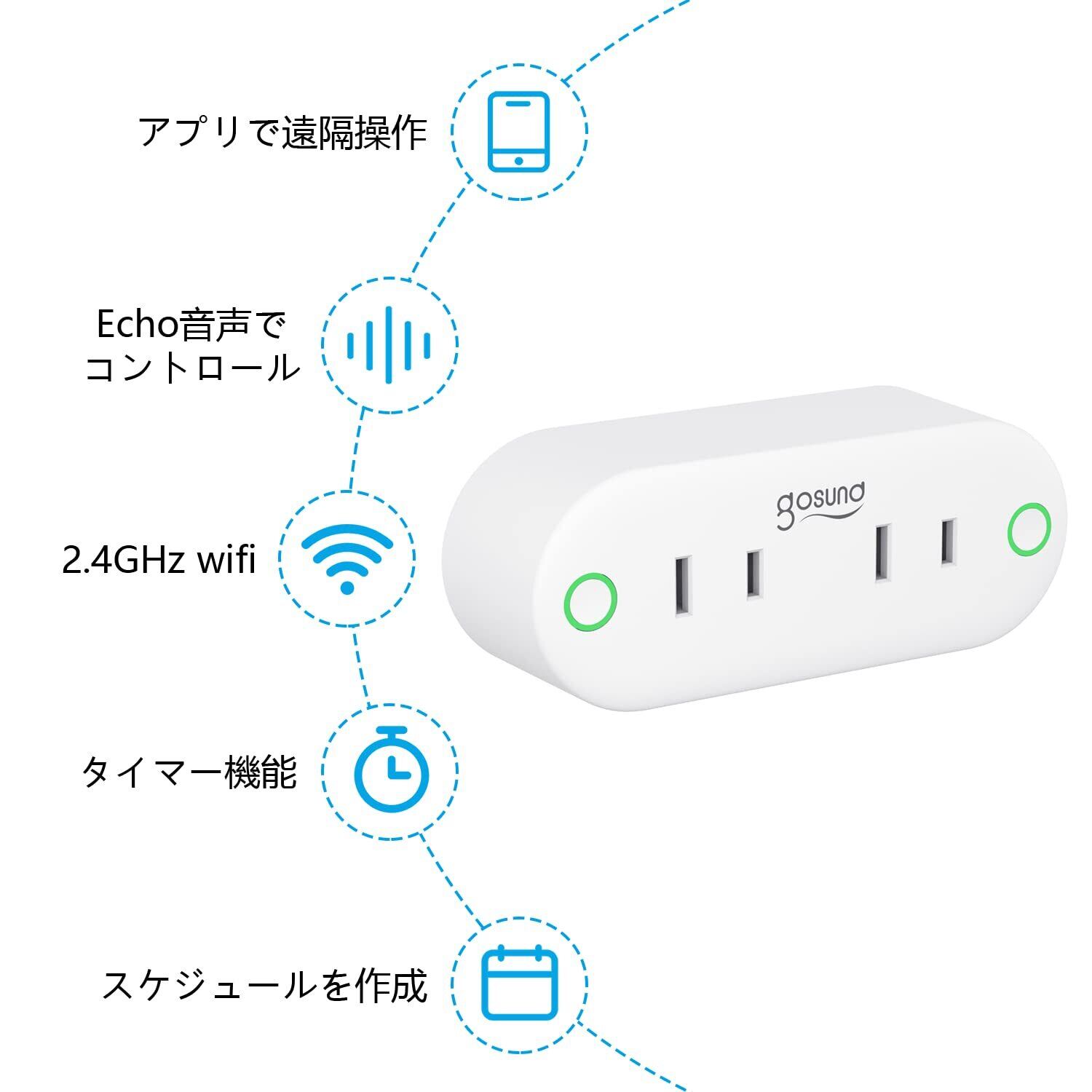 【Alexa対応】 ゴウサンド(Gosund) スマートWi-Fiコンセント Alexa Google Assistant対応 遠隔制御と音声操作 ハブ不要 2口ACプラグ コンセントタイマー機能付き JP2