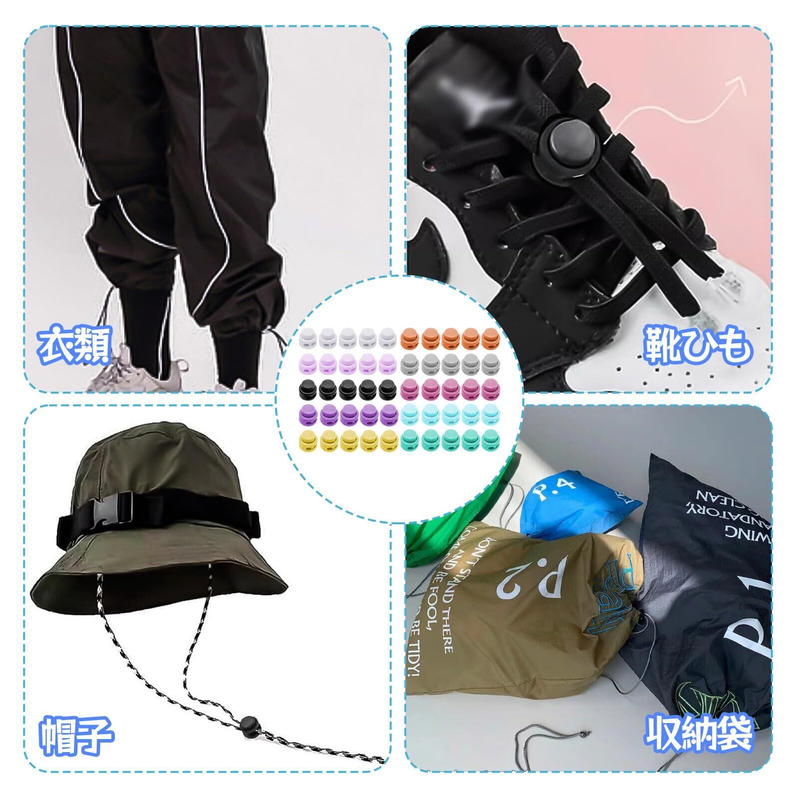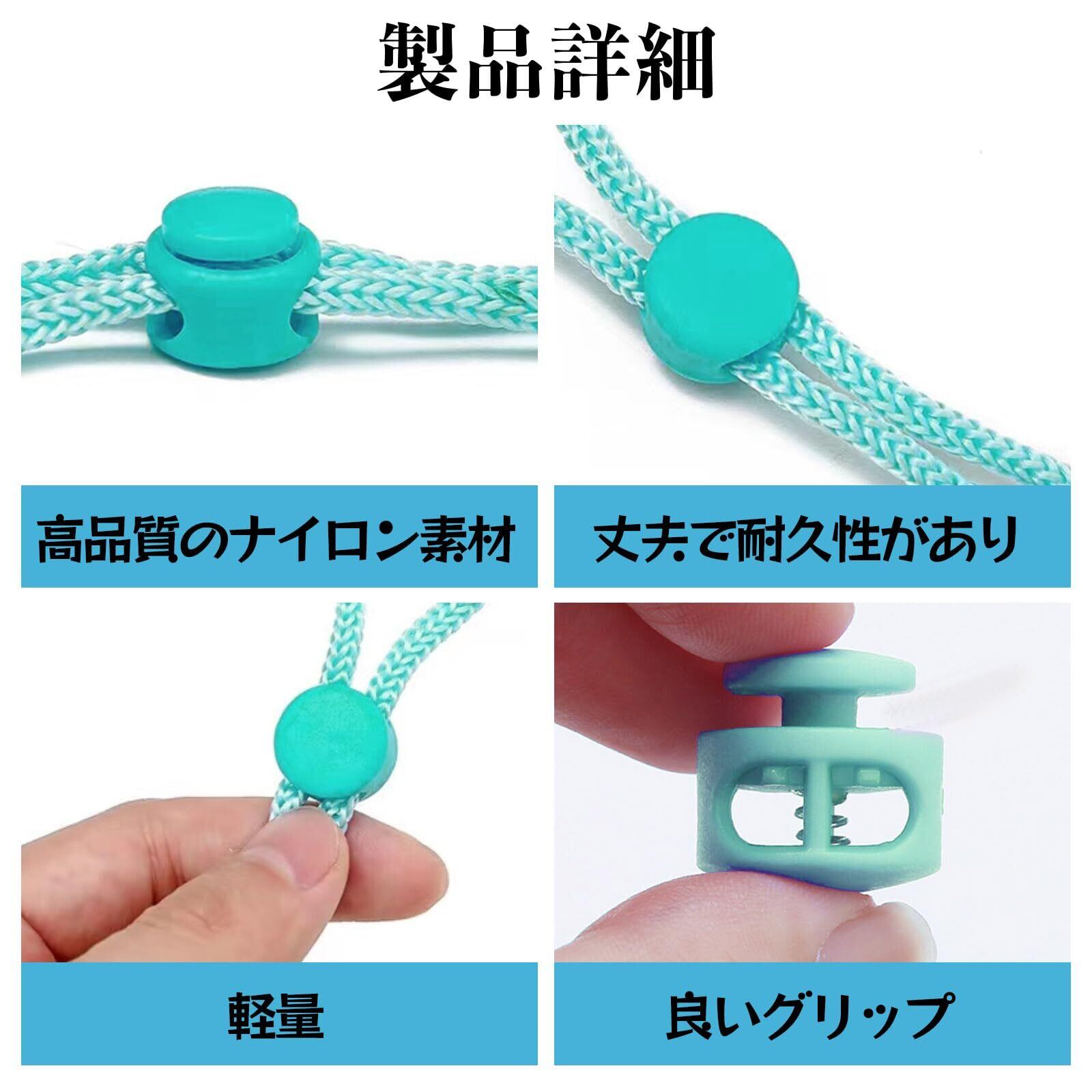 【幅広い用途】コードストッパーはランヤードバッグ、ドローストリング、荷物、衣類、バックパック、スポーツウェア、靴ひも、おもちゃ袋、バンダナ、スウェットジャケット、帽子、収納袋、ハンモック、テント、屋内と屋外、フィットネス製品な。
