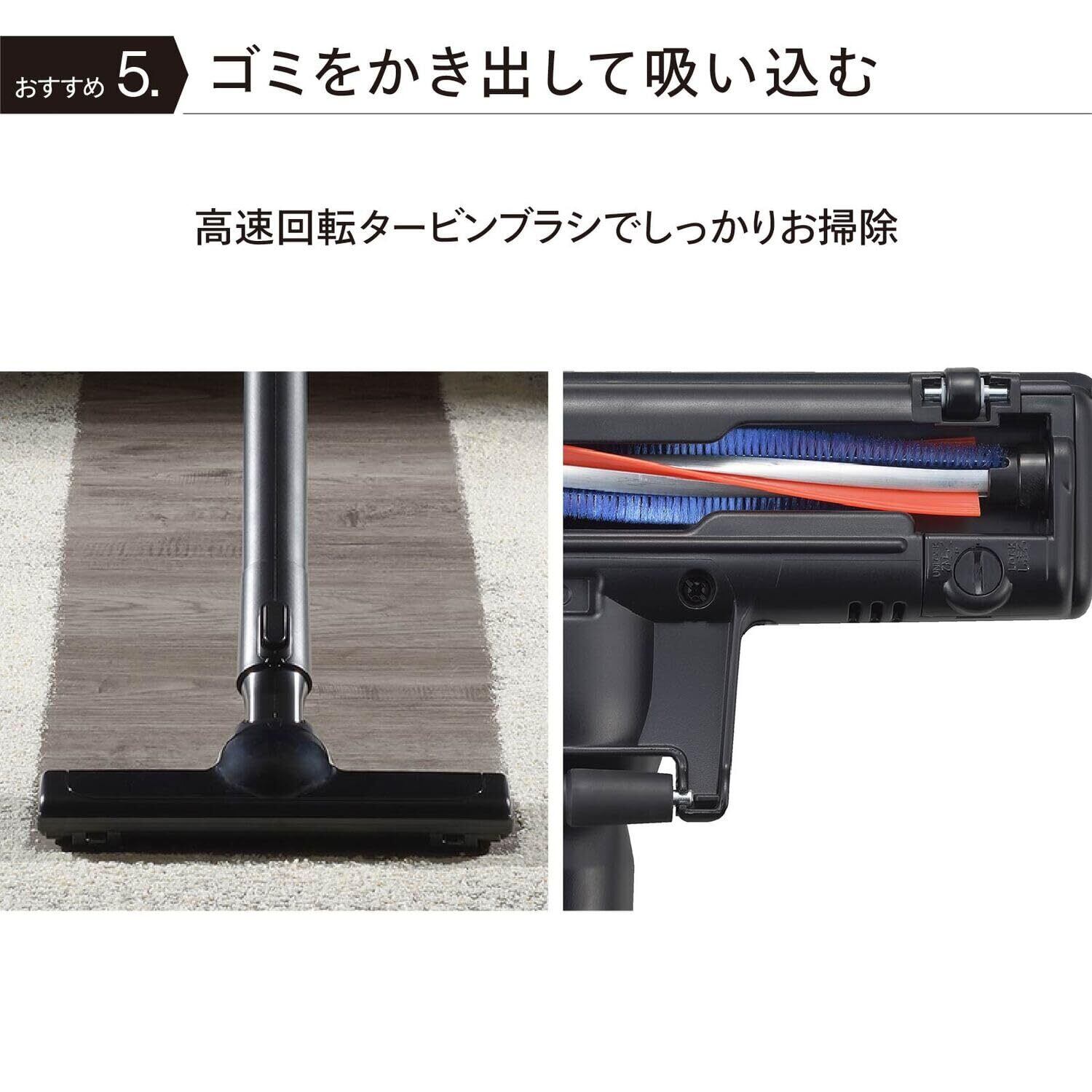 【ゴミをかき出して吸込むタービングブラシ】吸引の風を利用して高速回転するタービンブラシでゴミをかき出し、フローリングの溝やカーペットの奥のゴミもしっかりと吸い込みます。