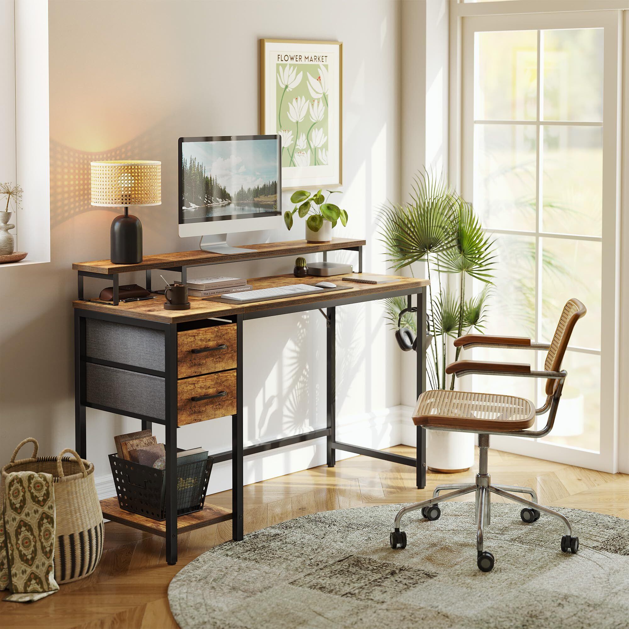 【大きな収納スペース】ラックは、本、事務用品、書類、その他の日常用品を収納するための大きなスペースを提供します。各引き出しは、電子機器や雑誌を簡単に保管することができ、作業エリアの整理整頓を維持します。