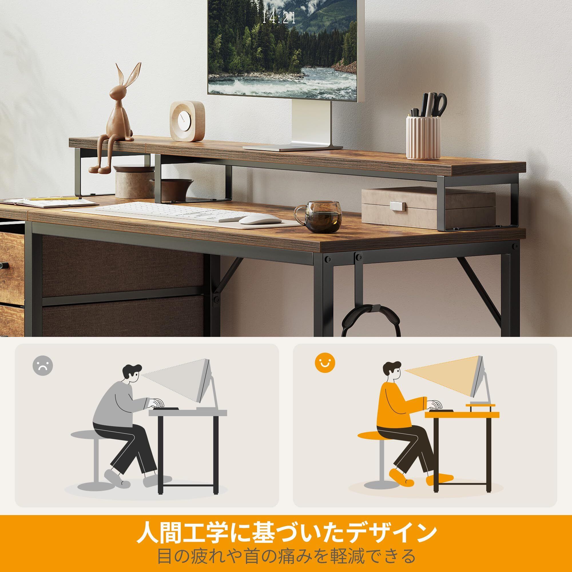 【モニタースタンド】 引き出し付きの上棚は、デスクトップをすっきりさせ、モニターを目の高さまで上げられるので、首や背中の負担を軽減します。