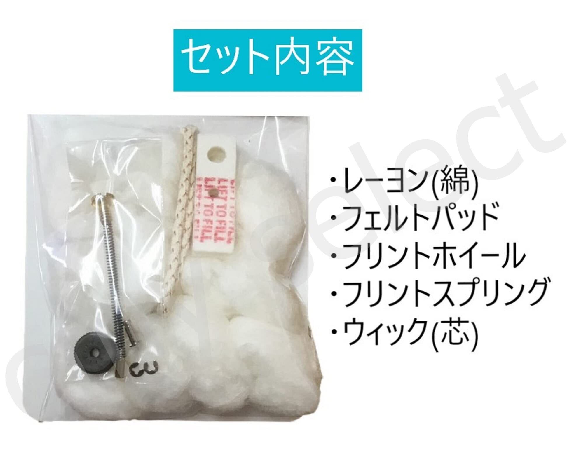 【セット内容】ウィック(芯)、レーヨン(綿)、フェルトパッド、フリントホイール、フリントスプリング