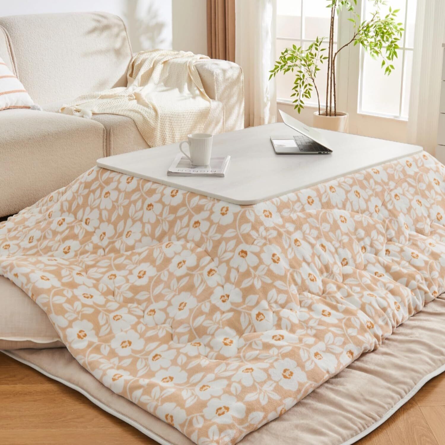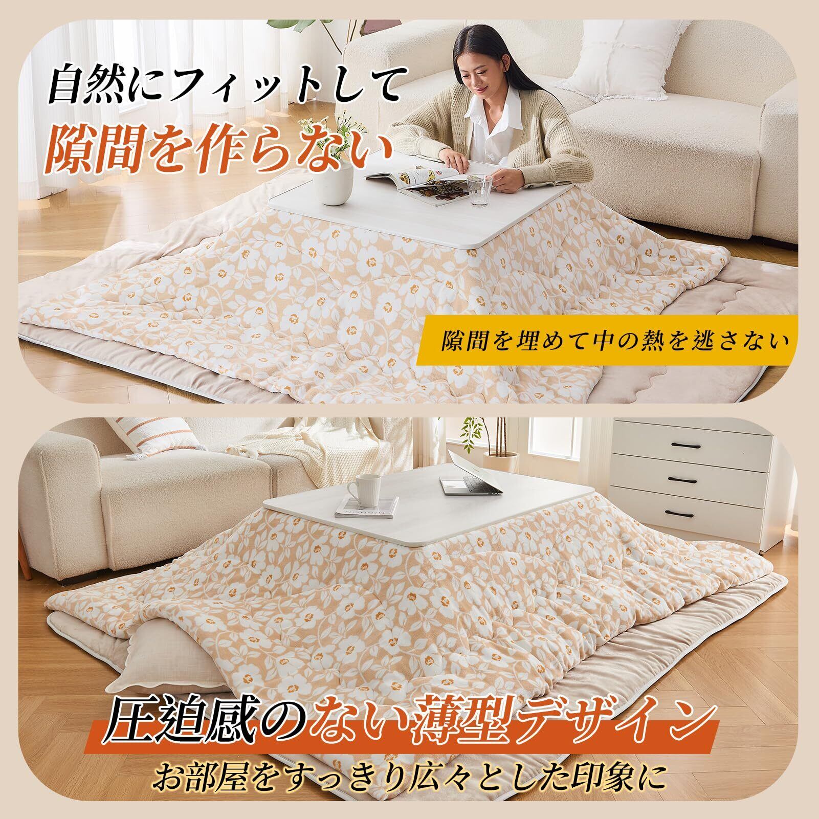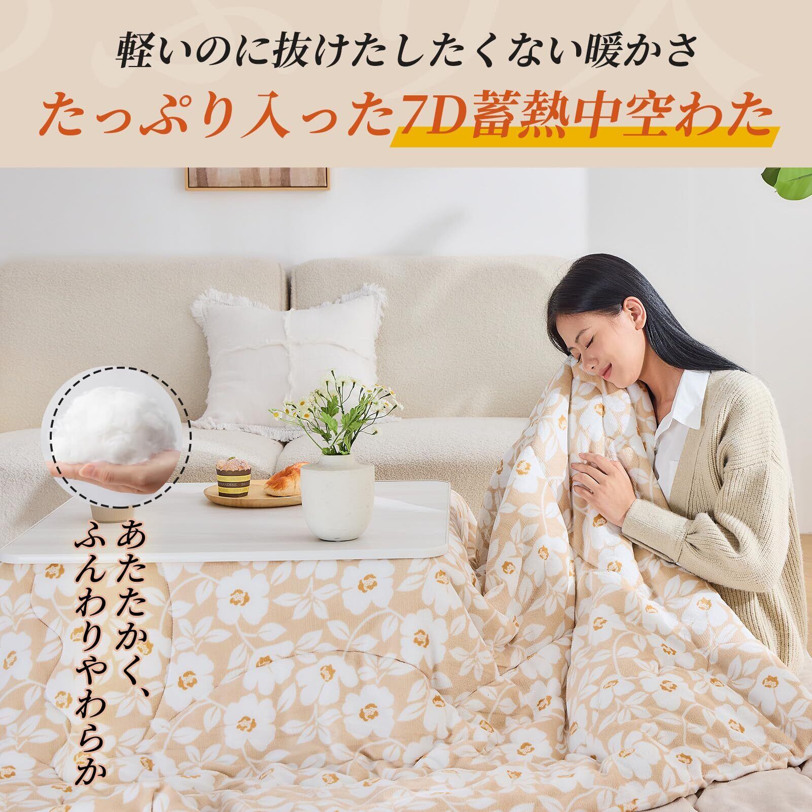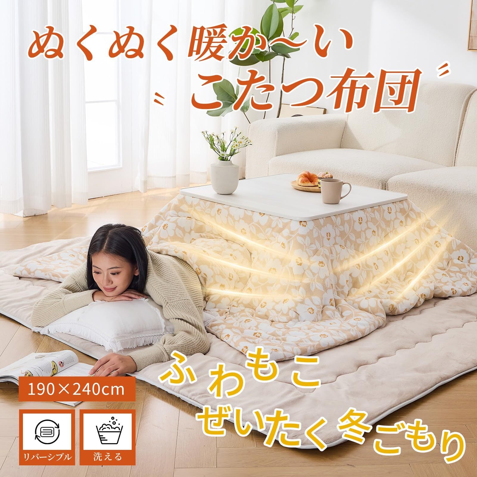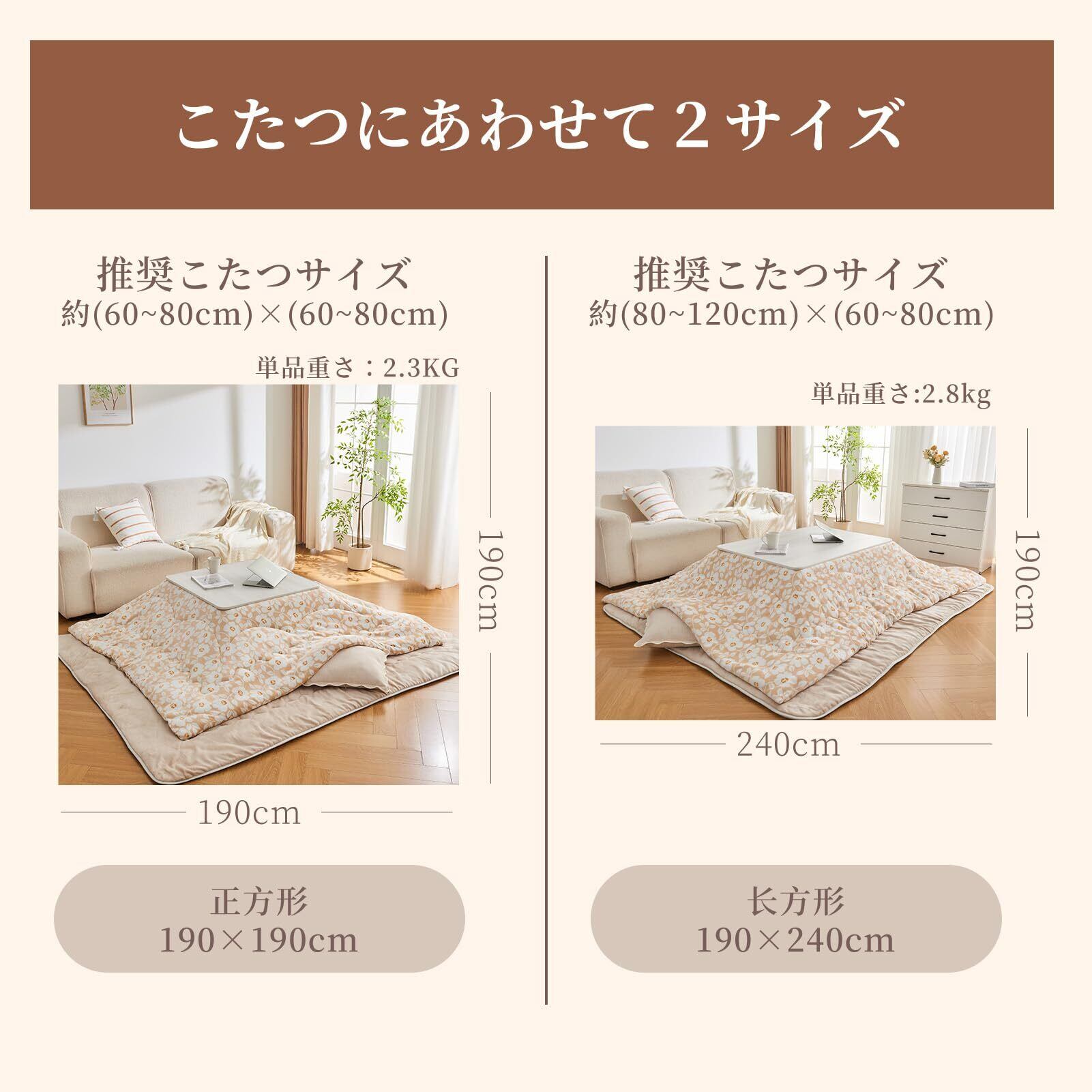 【商品情報】こたつ布団単品のサイズ・190x240cm(対応こたつ台:70~80×105~120cm);表地裏地・200g/m²高密度フランネル(美しい光沢感があり、手触りが良い);中綿・ポリエステル100%(350g/m²の詰め綿、約1.3kg)。※ご注意:掛け布団のみ単品販売となります。こたつ台は商品に含まれません。