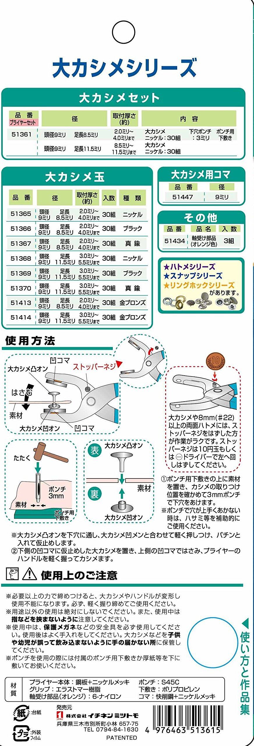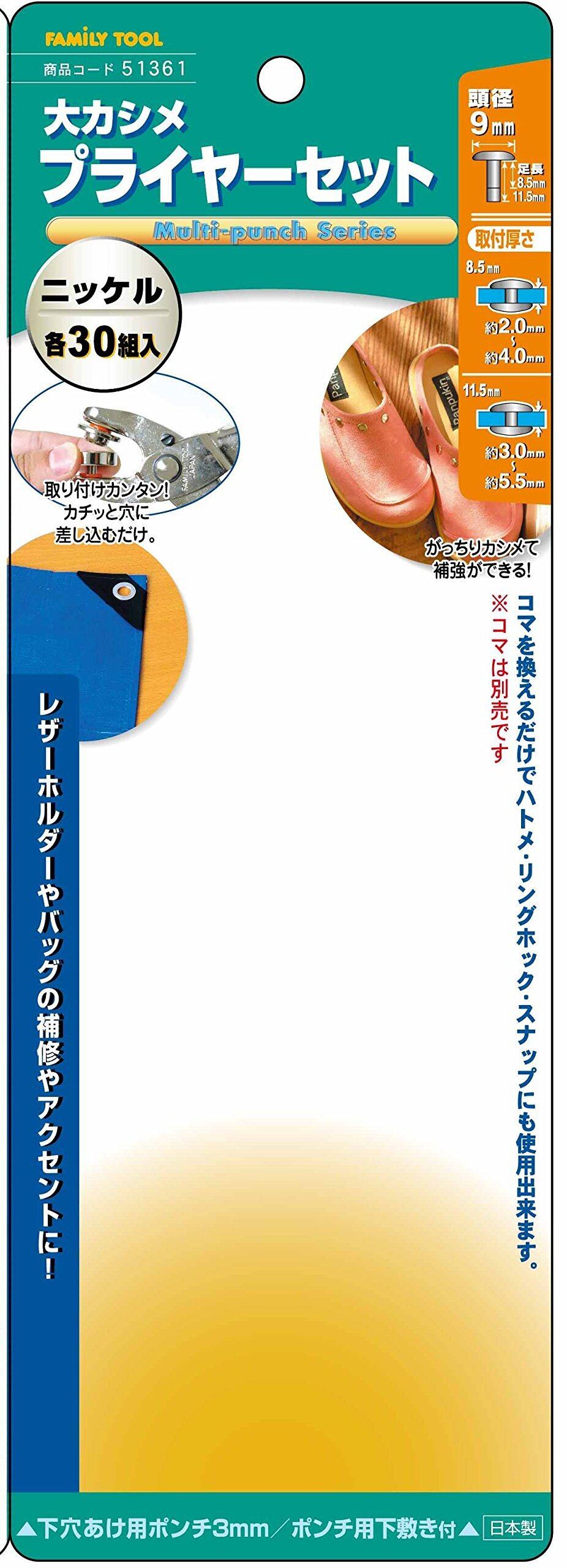 レザー用品などの補強、補修やアクセントにもなります。コマ(別売)を換えることでハトメやスナップ、リングホックにも使用することが出来、用途が広がります。穴に差し込むだけで準備ができるため、特別な技術や道具は必要ありません。