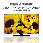 特徴 ケーブル直径約3.2mmで取り回しがしやすく、すっきり配線できる。1本のケーブルで映像信号と音声信号をデジタルで高速伝送するスーパースリムタイプのイーサネット対応ハイスピードHDMIケーブル。