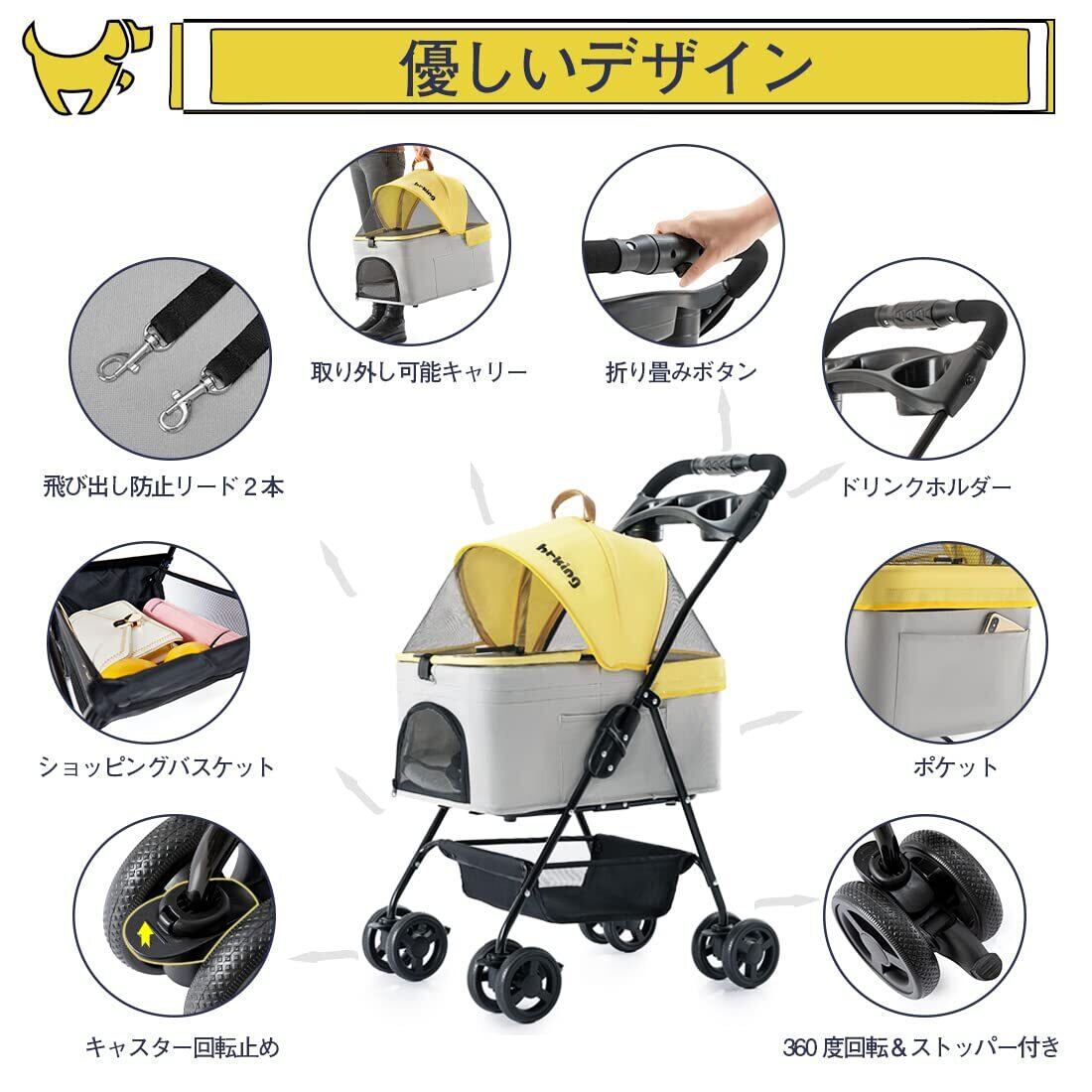 【在庫セール】HRking 分離型 ペットカート 2Way 軽量 折りたたみ 犬用ベビーカー 猫 小型犬 多頭用 ペットキャリー 4輪360°回転 多機能 取り外し可能 ペットバギー 組み立て簡単 お出かけ 介護用 旅行 ペット用カート 耐荷重15KG (イエロー+グレー)
