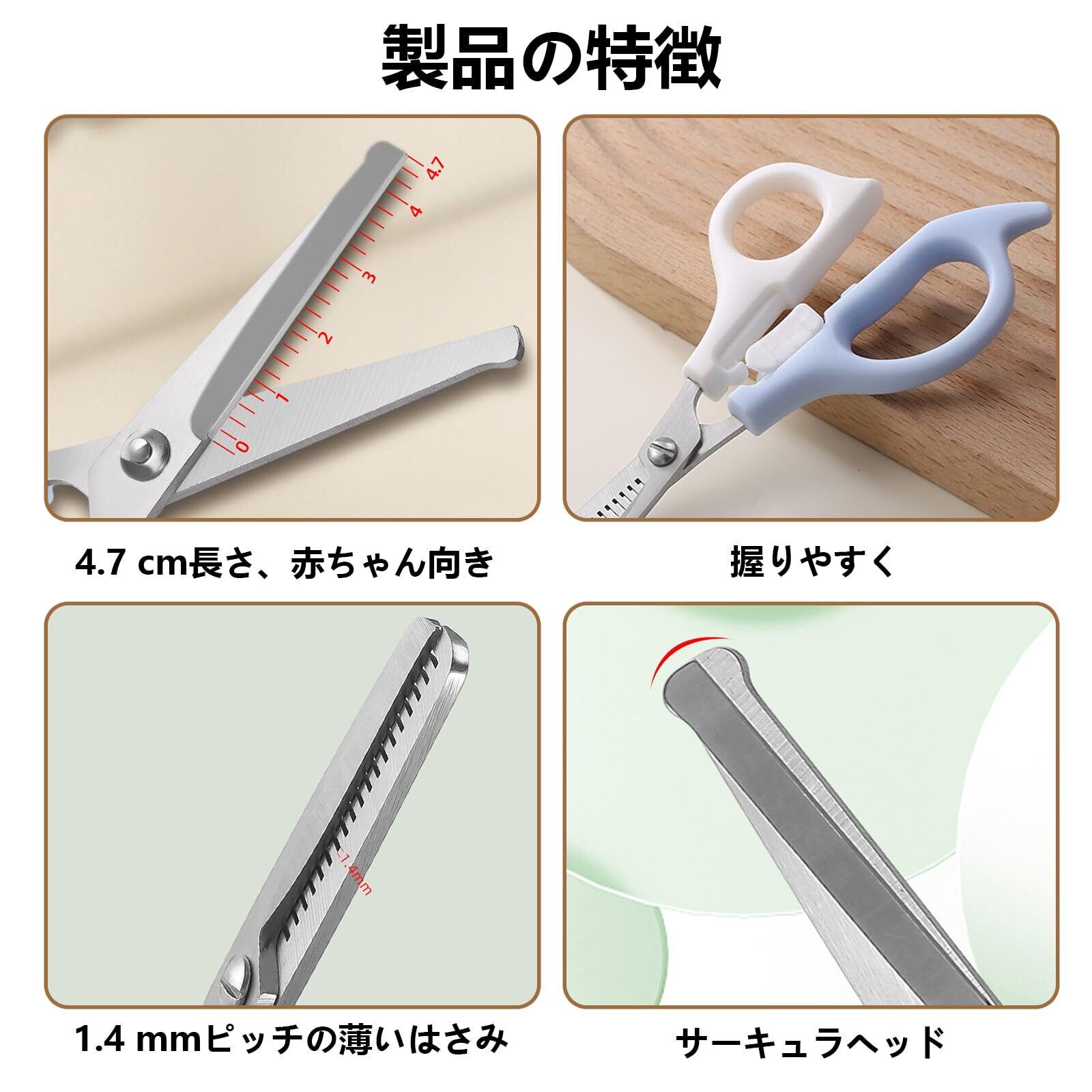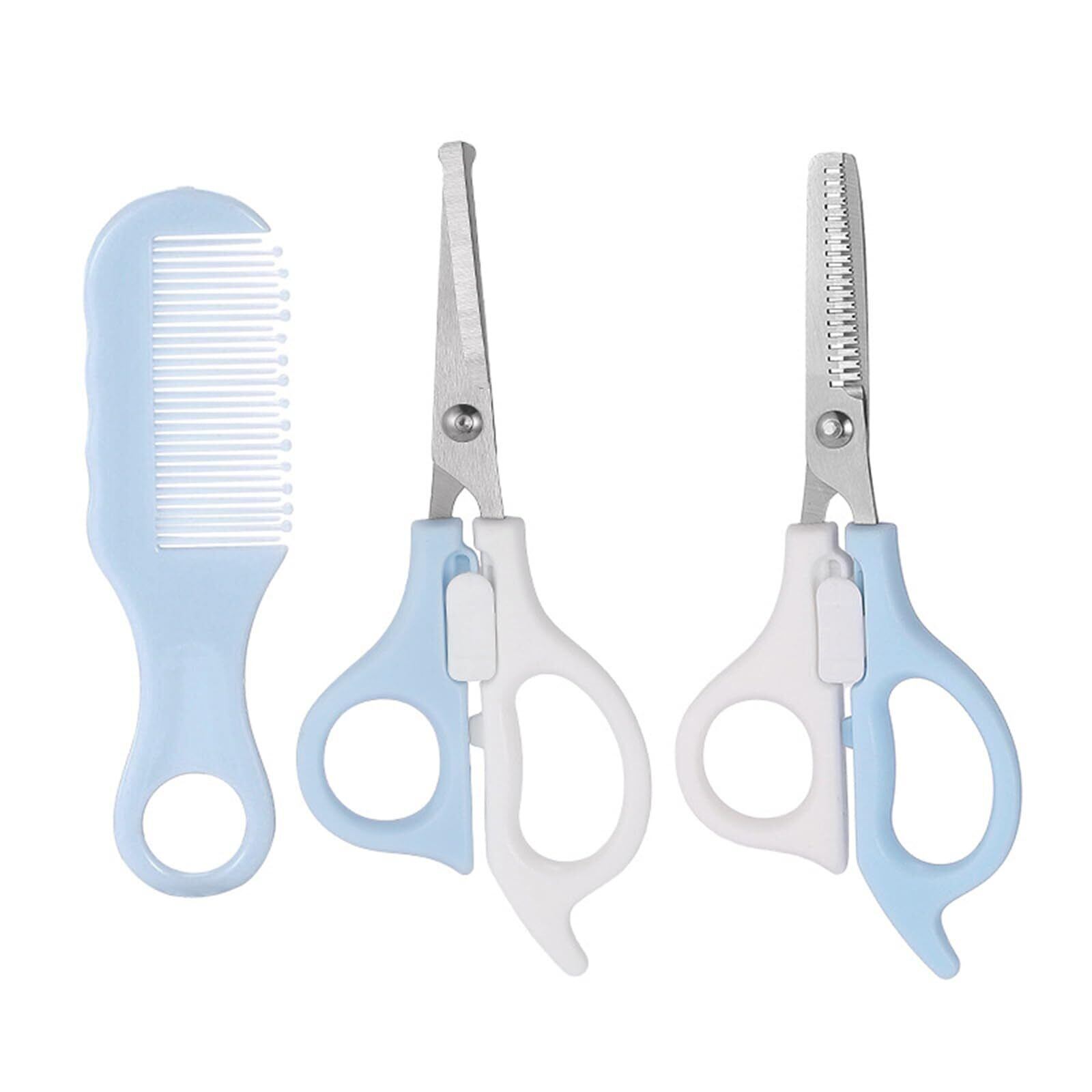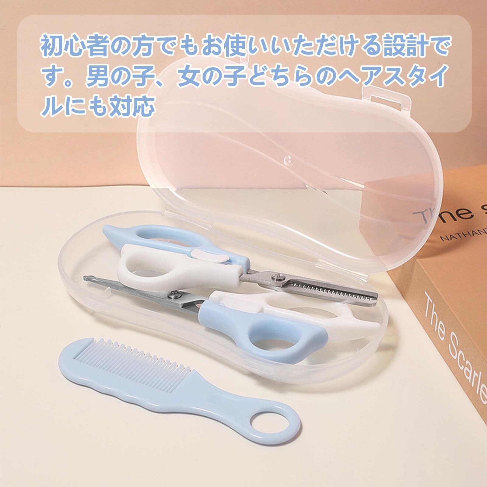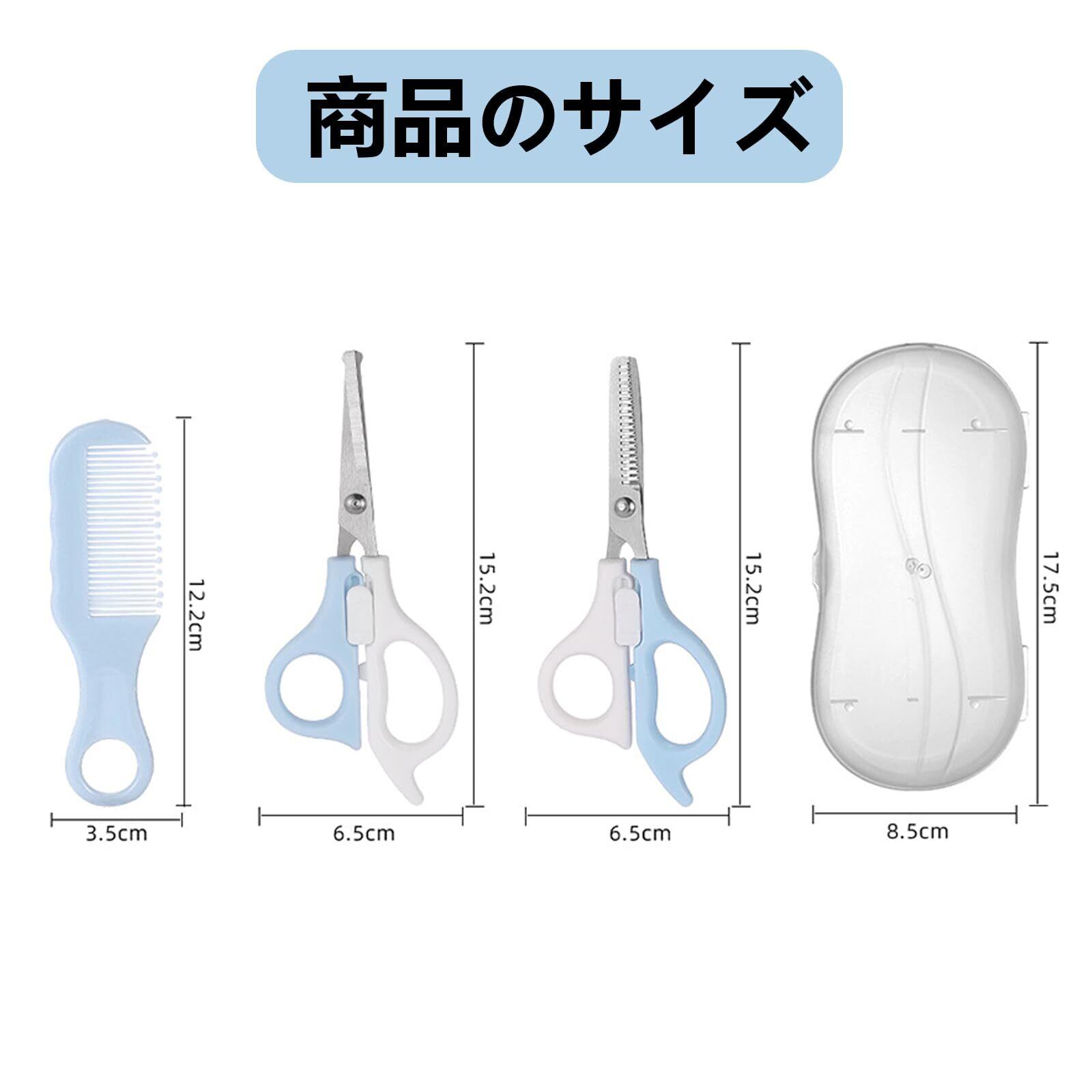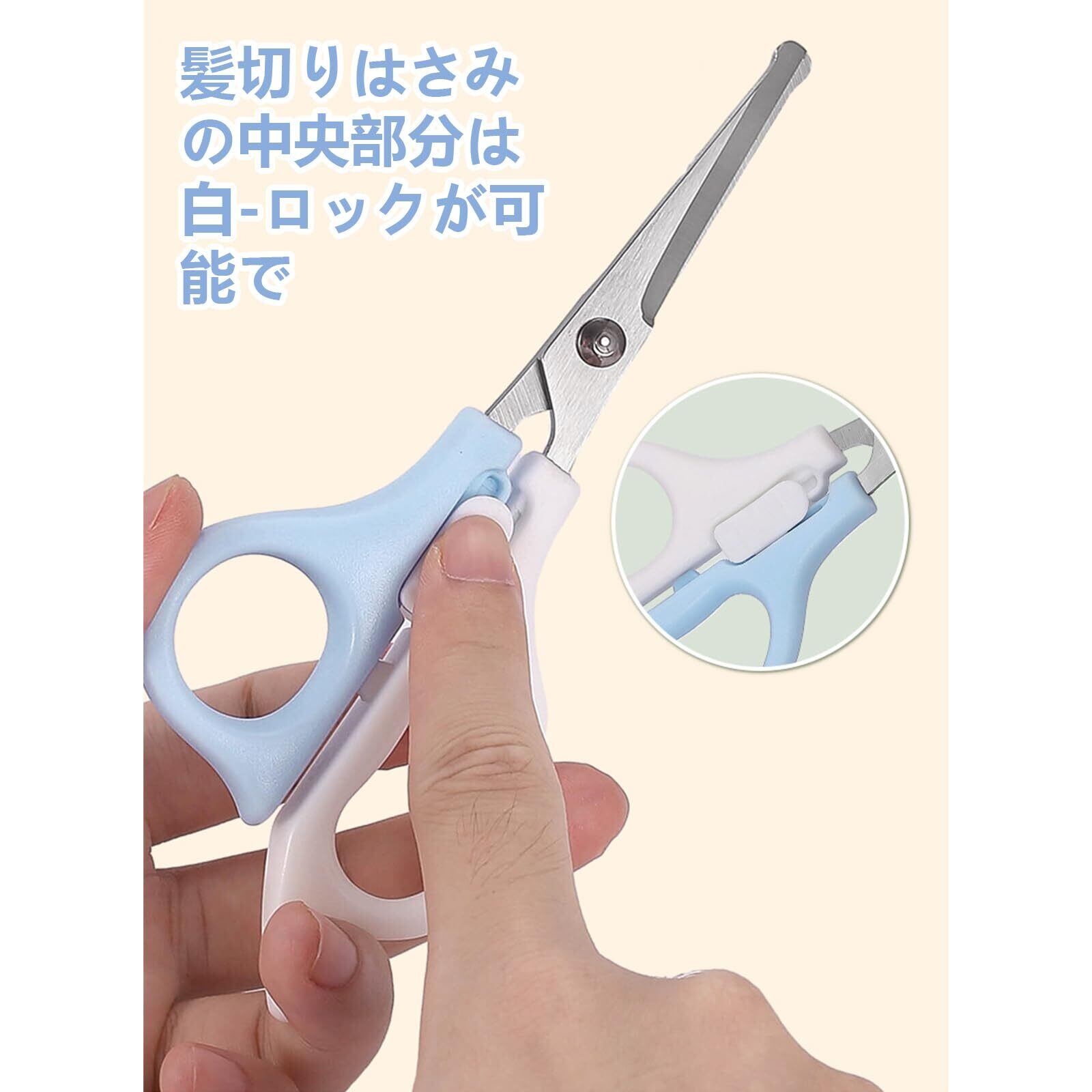 【安全設計】髪切りはさみの中央部分は白、ロックが可能で、いたずら好きな赤ちゃんが意図せずに開けてしまい、怪我をすることを防ぎます。ハサミの先端は普通のハサミよりも丸く、より安全です。クシの先端も丸く、髪を優しくとかすことができます。