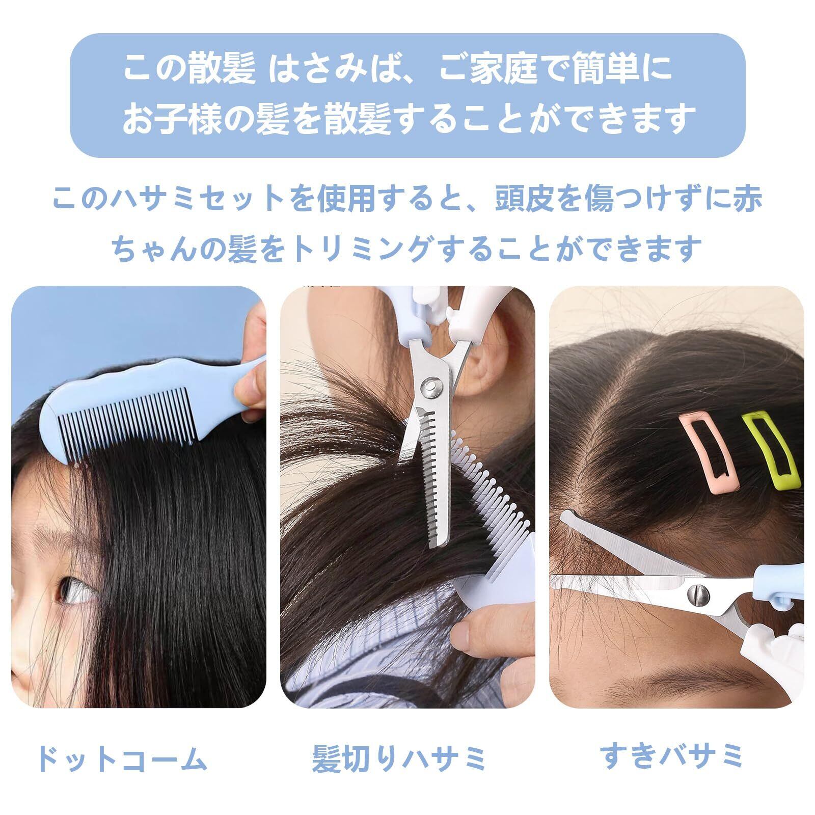 【散髪 はさみ】この散髪 はさみば、ご家庭で簡単にお子様の髪を散髪することができます。このハサミセットを使用すると、頭皮を傷つけずに赤ちゃんの髪をトリミングすることができます。まだ小さくてサロンに行けないお子さまや、サロンを嫌がるお子さまに最適です。