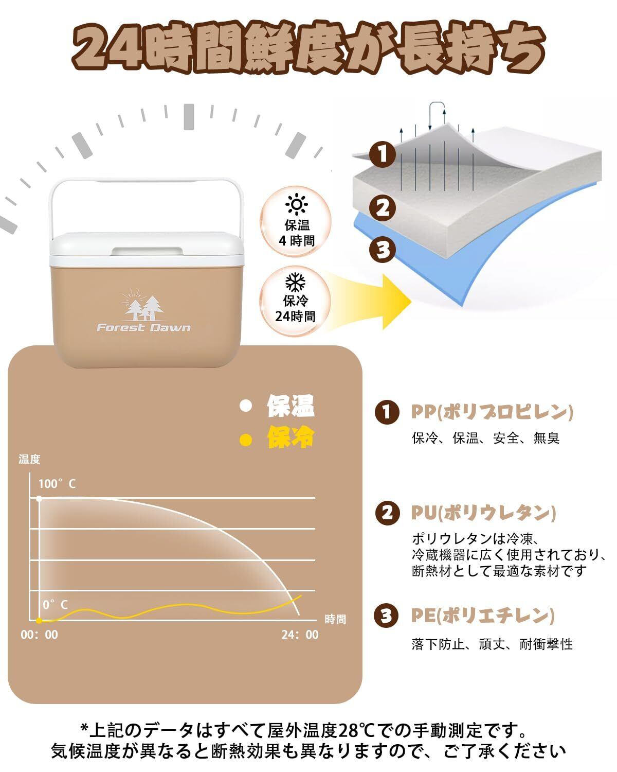 【鮮度保持・保冷&保温】:こちらのコンパクトな保温ボックスは日帰りのお出かけに最適で、冷蔵保存は12〜24時間、保温は約4時間まで可能です。また断熱層には、冷凍・冷蔵設備に最適な断熱材であるPU(ポリウレタンフォーム)を採用しており、底部の断熱層を上部の嵌め込み式バックルで留めることで、全体の密閉性と断熱性がさらに向上します。内側には食品グレードのPP素材を採用しており、安全で臭いがなく、長時間の鮮度保持を実現します。