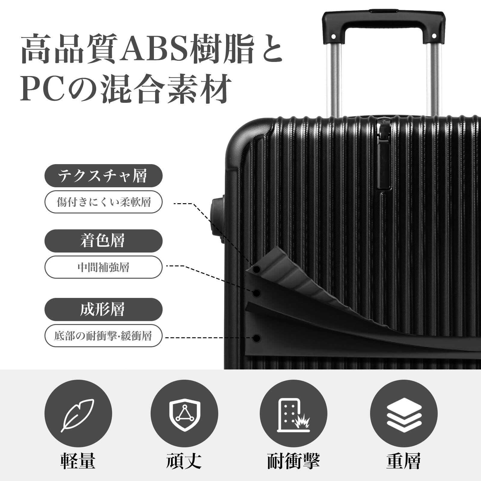 【新登場・高品質なボディ】ボディは耐久性や耐衝撃性に優れるABS+PC樹脂の高品質素材。純粋なABS材料よりも頑丈で、純粋なPC材料よりも軽量で、傷がつきにくいです。使用中にスーツケースが破損する心配がなく、安心してご利用いただけます。