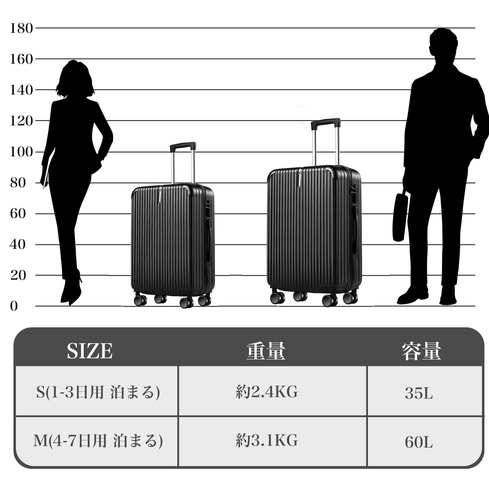 【ABSとPC&耐衝撃】機内持ち込みOK (Sサイズ):約W37×D22×H57cm、三辺の和は116cm、容量は約35L、重量は約2.4kgです。キャリーケースの表面はPC(ポリカーボネート)を使用、そして、傷が目立ちにくいマットエンボス加工、高耐衝撃性を持ち、高弾性で、変形しにくいです。中央は高品質ABS樹脂を使用、防水性、耐摩耗性を備えています。