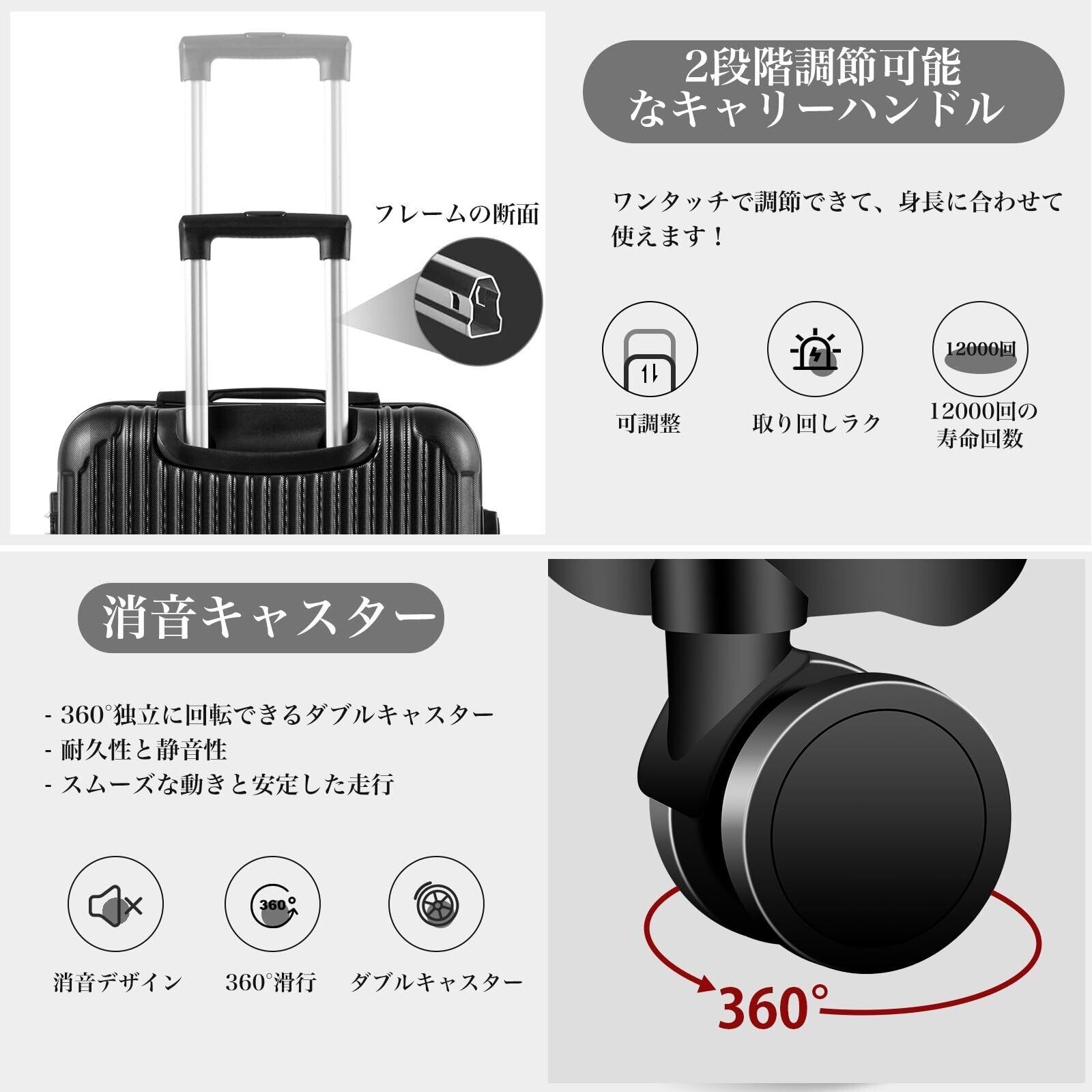 【多段階キャリバー&消音キャスター】スーツケースは超軽量アルミ製キャリバーを採用、頑丈で揺れ動きにくく、キャリバーの高さを2段階で自由調節できます。高弾性TPE衝撃軽減素材&360°独立回転できるダブルキャスターを採用し、スムーズな動きと安定した走行が可能となります。