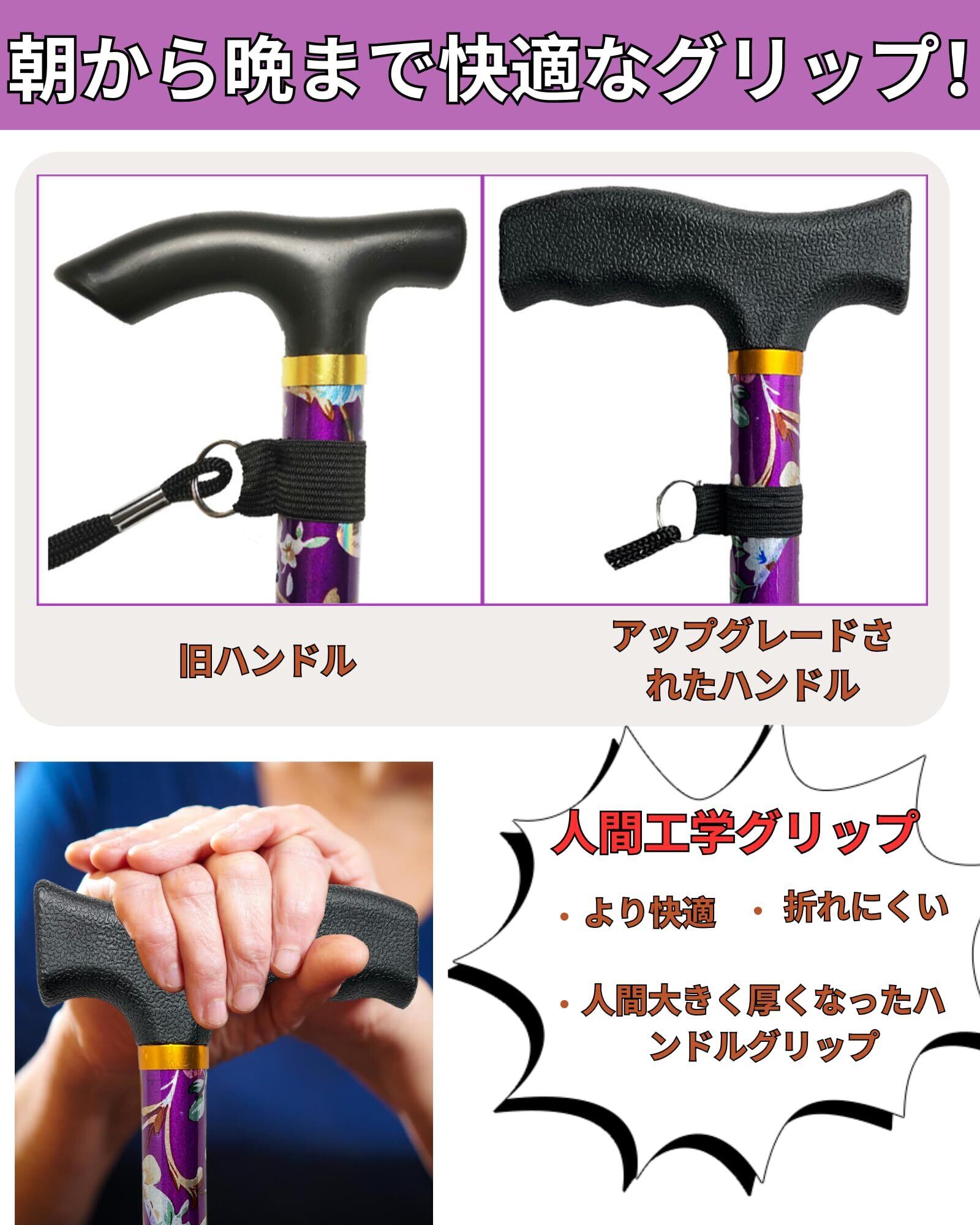 【花柄折り畳み式杖-軽量】耐久性のあるアルミニウム製。 バージョンアップ版のスティックの重さはわずか270gですが、頑丈です、日常生活では安定して使えます。非常に軽量で、鞄の中に入れても重みを感じることなく、楽に持ち運びが可能です。持ち運びに便利な折り畳み式の杖です。女性は持ち運びや使用が簡単です。