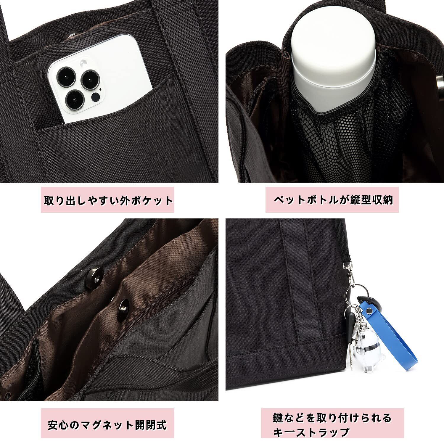 【3仕切りでスッキリ収納】ENLANトートバッグには3つの仕切りと4つのポケットがあり、荷物はサッと入れやすく、スッキリかつ楽に収納できます。荷物は綺麗に整理整頓して入れられる手提げバッグです。またペットボトルは立てて収納できてより便利に使用できます。普段使いにも、通勤バックにも使えます。