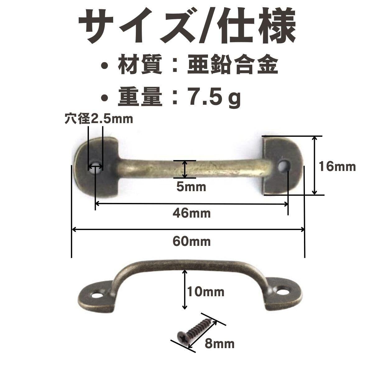 サイズ:全長60mm 台座(ネジ固定部分/高さ16mm×幅10mm 取っ手部分/直径5mm ネジ穴ピッチ/46mm ネジM2×8mm