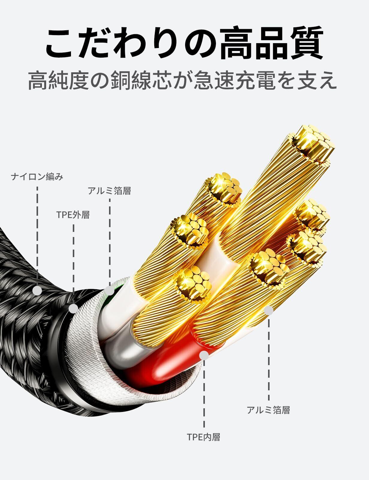 【こだわりの構造で耐久性アップ】①端子部分はアルミコネクタを採用、耐久性が高くて軽量です。②高級感のある高密度ナイロンを使用、 ケーブル内部のワイヤーを断線から保護します。③ロングカバー搭載。約10000+以上の折り曲げにも耐え、優れた耐久性を実現。