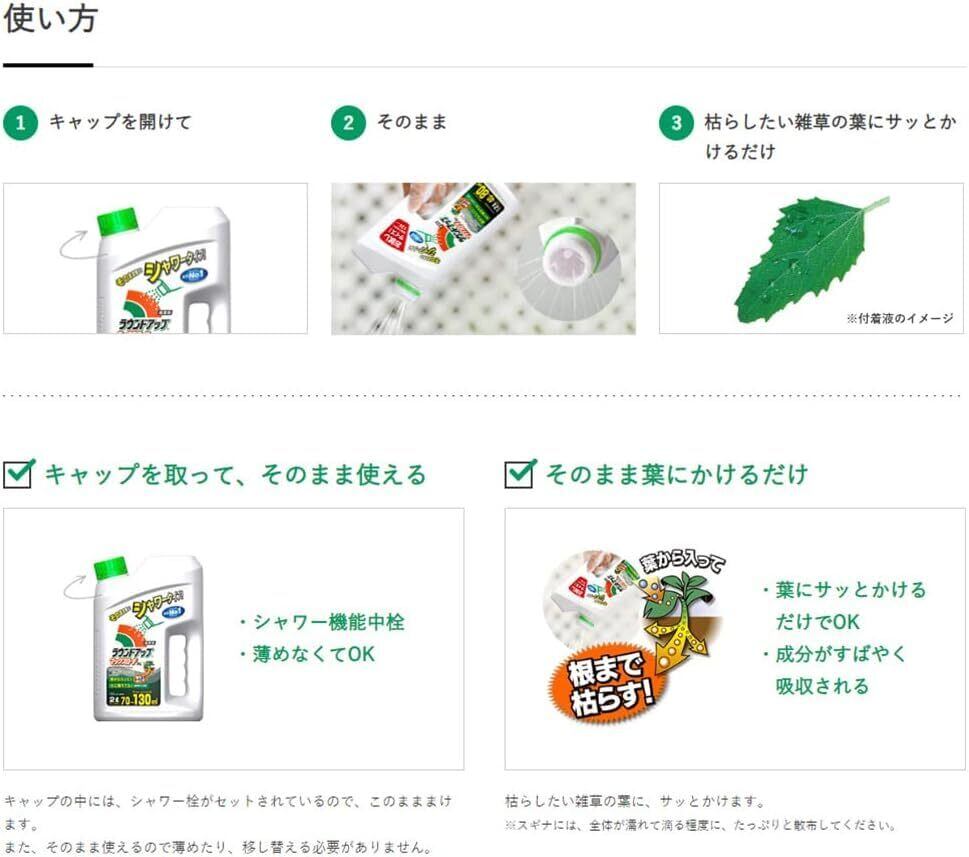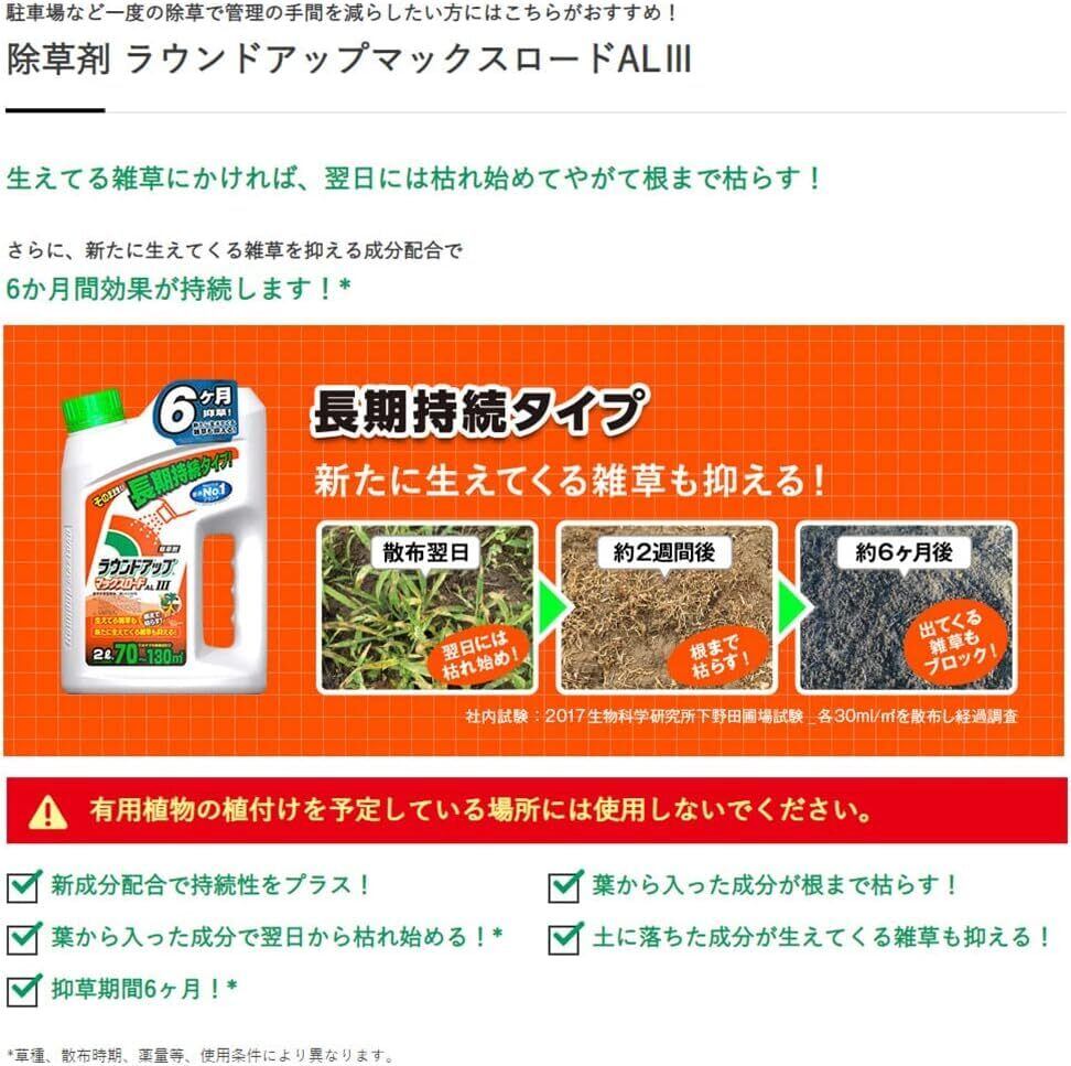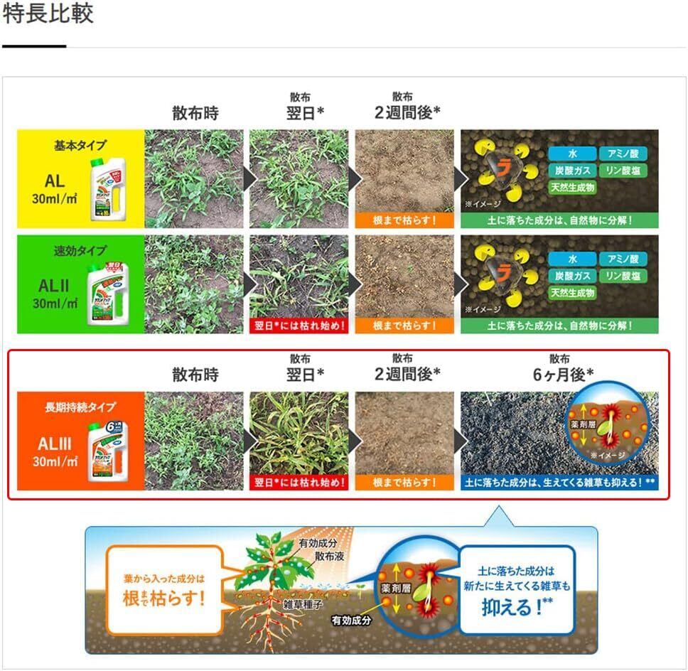 6か月間効果が持続、そのまま撒ける、葉から入って根まで枯らす除草剤