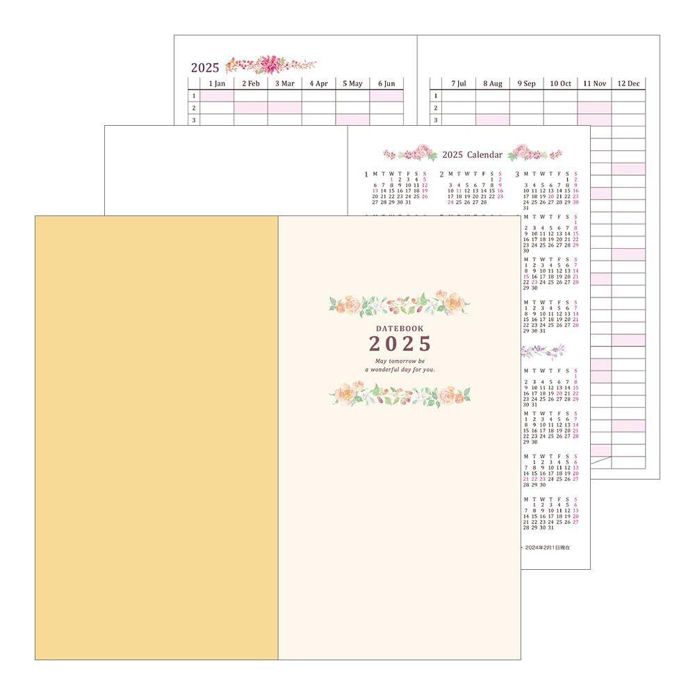 イラストレーター黒岩多貴子さんが描く、みずみずしい花のイラストが魅力的なダイアリーです。バラをはじめ、ピオニーやダウカス、ラベンダーとハーブ、ノブドウやフランネルフラワーそして大人っぽいダリアなど季節の花をあしらいました。2025年版の表紙の花は「バラとベリーの実物」をメインに、ブラックベリーやバーゼリアを交えてアンティーク感のあるブーケをイメージしています。見開きで1ヵ月のスケジュールが管理できる、月間ブロックタイプ。薄く持ち運びに便利なスリムサイズの手帳で、カバーの内側にはペンホルダーが付いています。「ポケットダイアリー」は、日常を楽しく彩る手帳シリーズとして1984年に誕生しました。お好みで選べる豊富なサイズとデザインでご好評をいただき、今日まで多くの方にご愛用いただいています。フルカラーの本文は毎ページデザインがかわり、1年間飽きずにお使いいただけます。