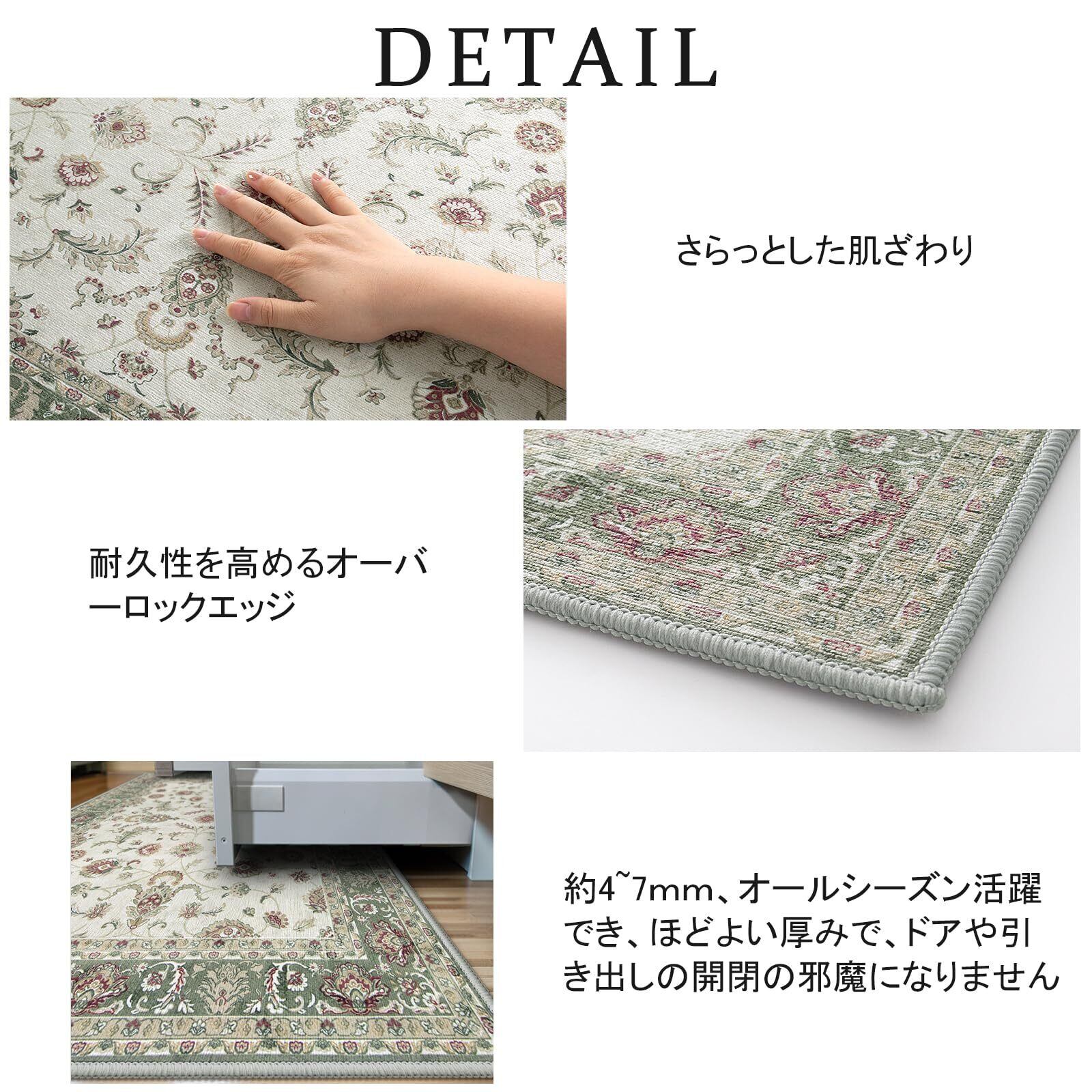【幅広く活躍】さらっと滑らかな肌触りとほどよい厚みで、春から冬にかけてオールシーズンにお使いできます。床を 保護だけでなく、インテリアとしてもぴったりです。ベッドサイド、リビングルーム、ベランダ、やダイニングのテーブルの 下など幅広く活躍します