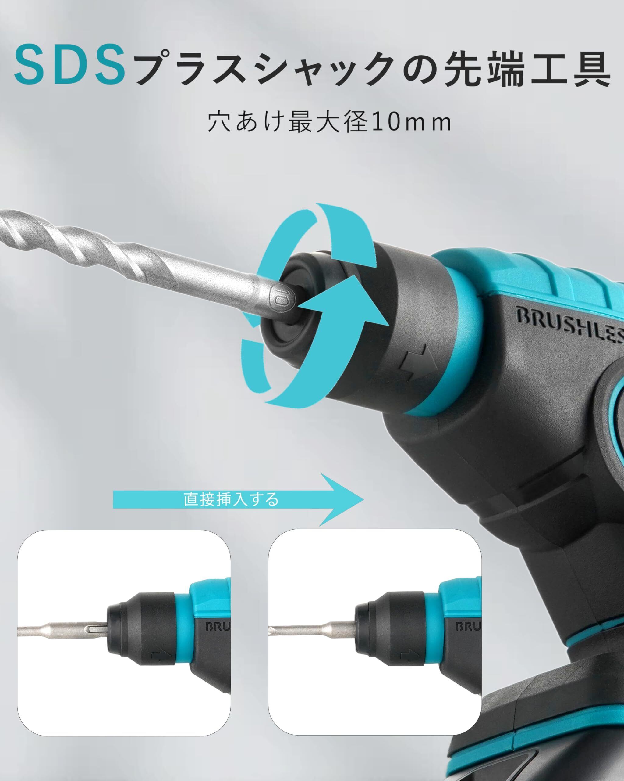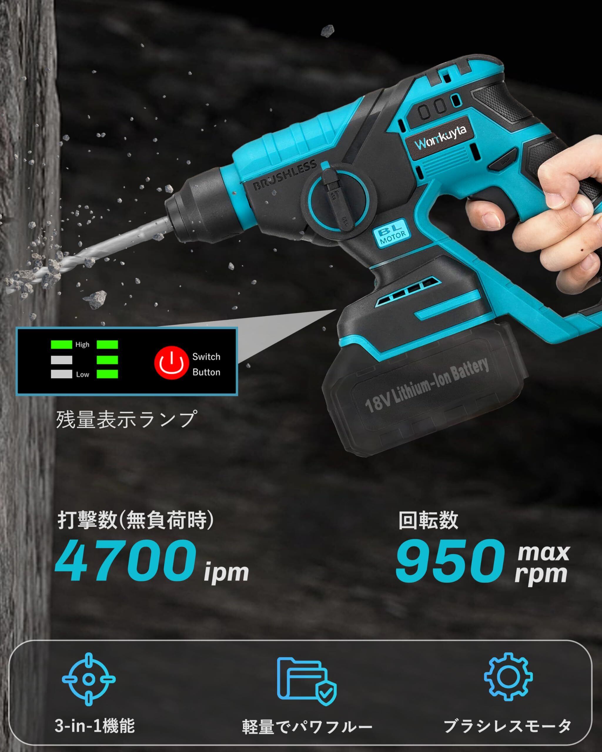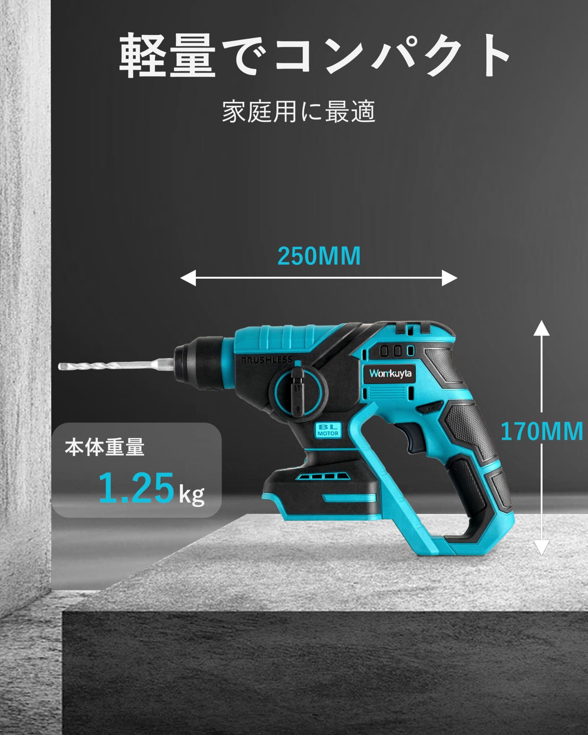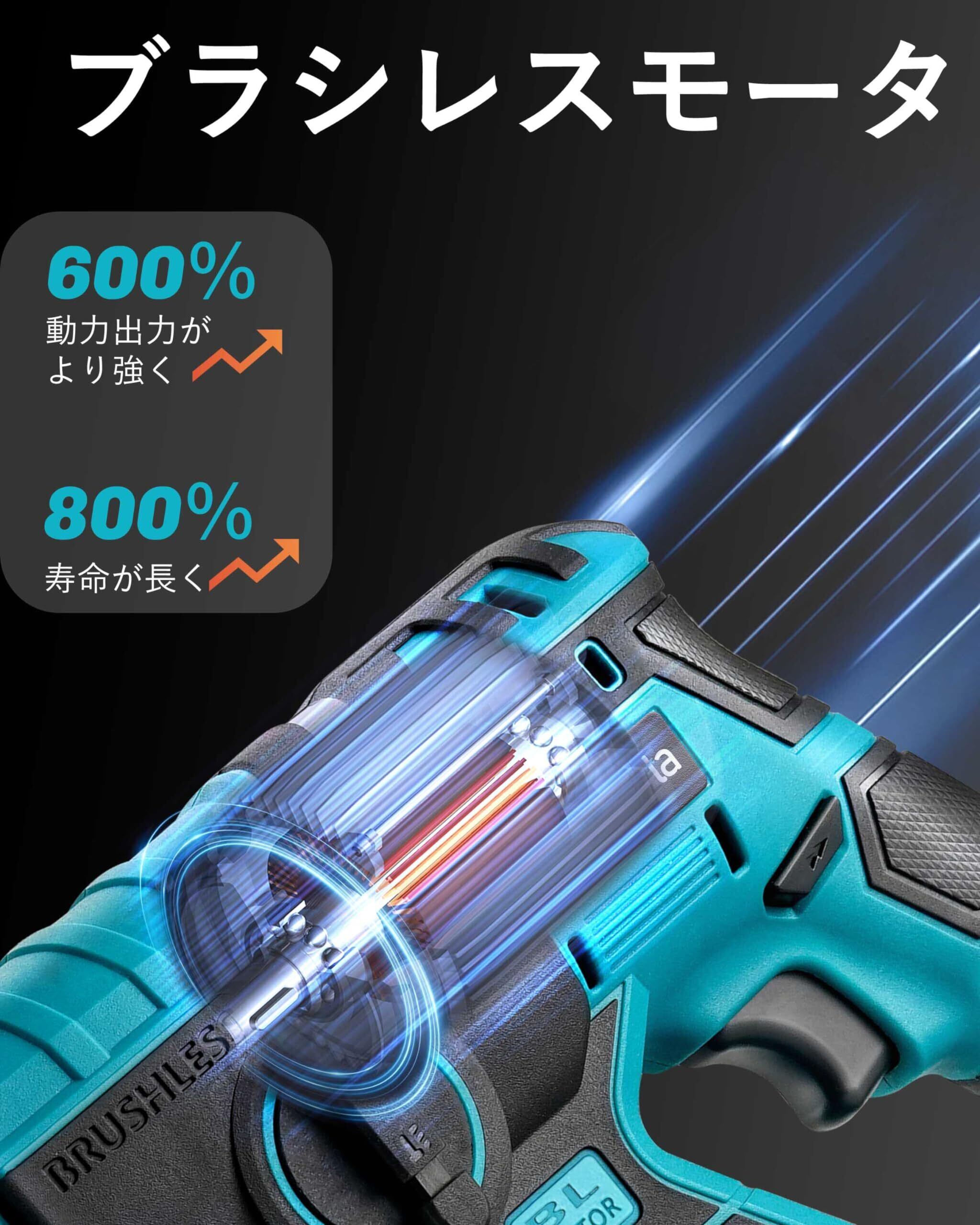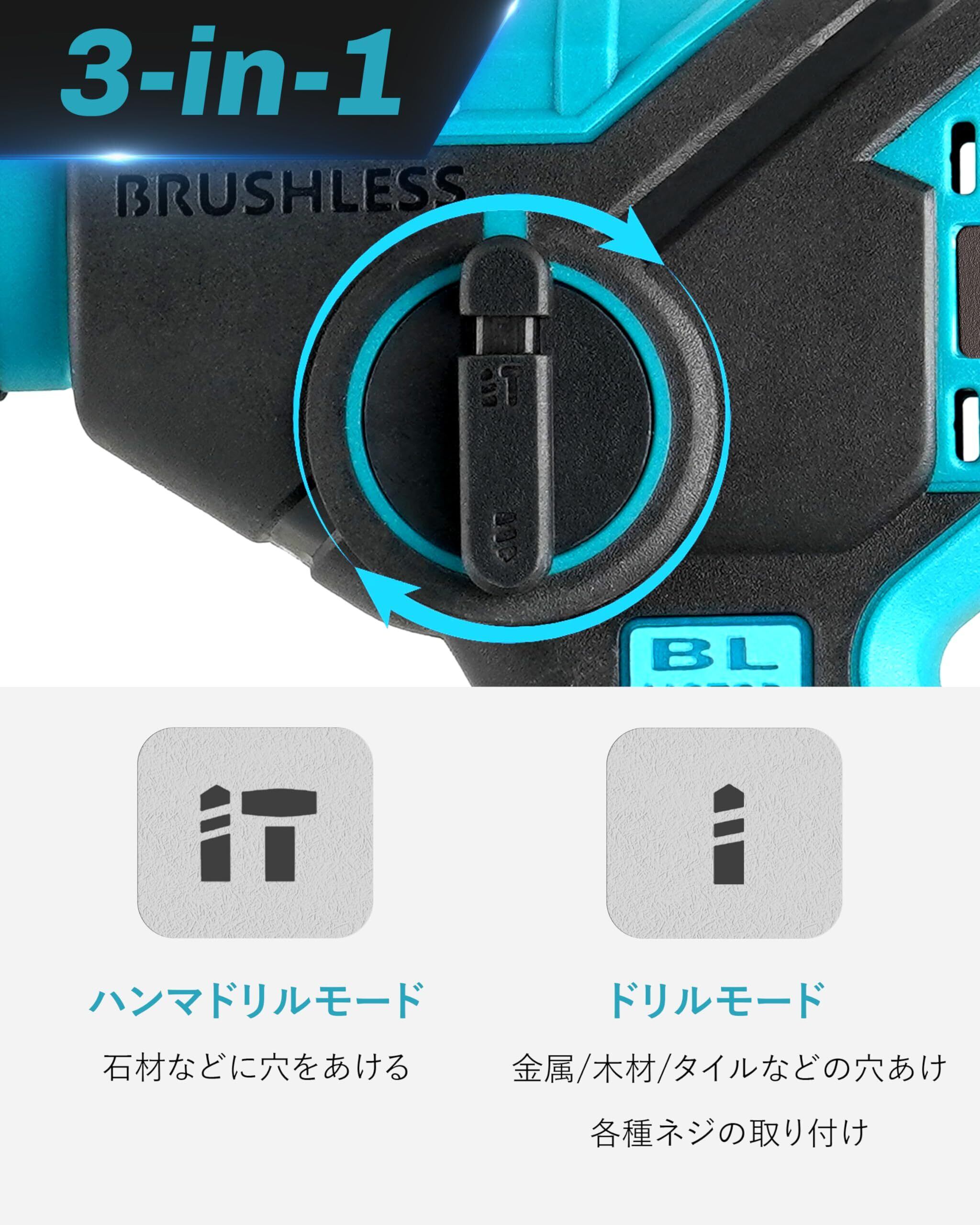 電式ハンマードリル 18V充電式ドリル 打撃ドリル ブラシレスモーター搭載 正逆転両用 コンパクト 軽量 ブロック・コンクリート・レンガ・木材・スチール・アルミニウム・タイル・プラスチック・石材・壁・金属・木材の穴あけ、ハツリ(斫り)工事に最適 大工道具 DIY用 日本語取扱説明書付き 18Vバッテリー対応 ケース付属【本体のみ、バッテリー・充電器別売り】