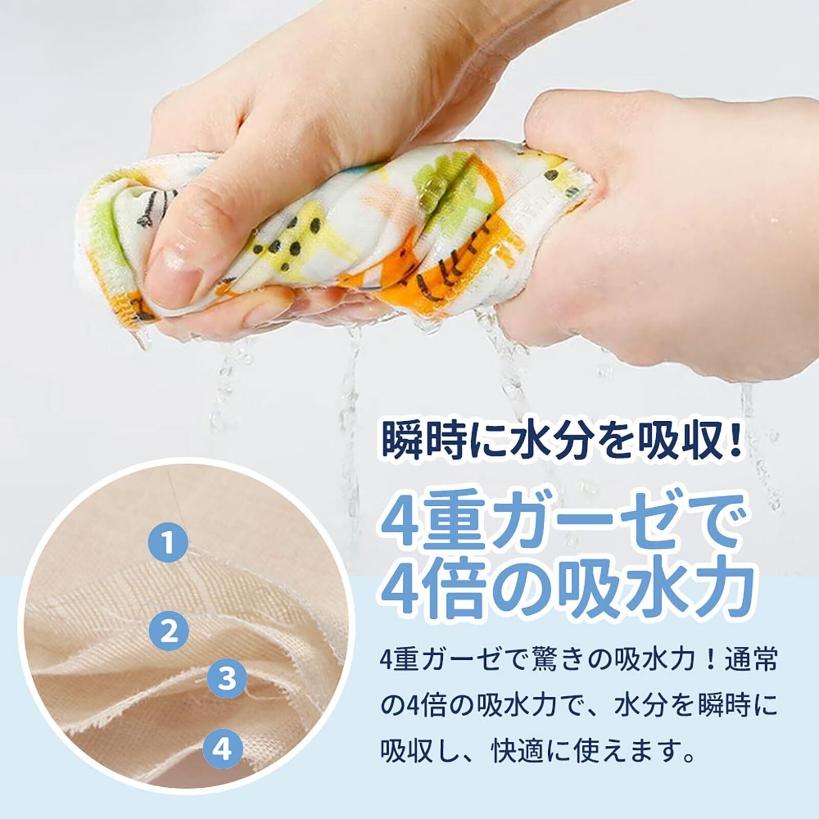 [4倍吸水量]4層ガーゼでさっと水分を吸収し、速乾性もよくいつでも気持ちよくお使い頂けます!