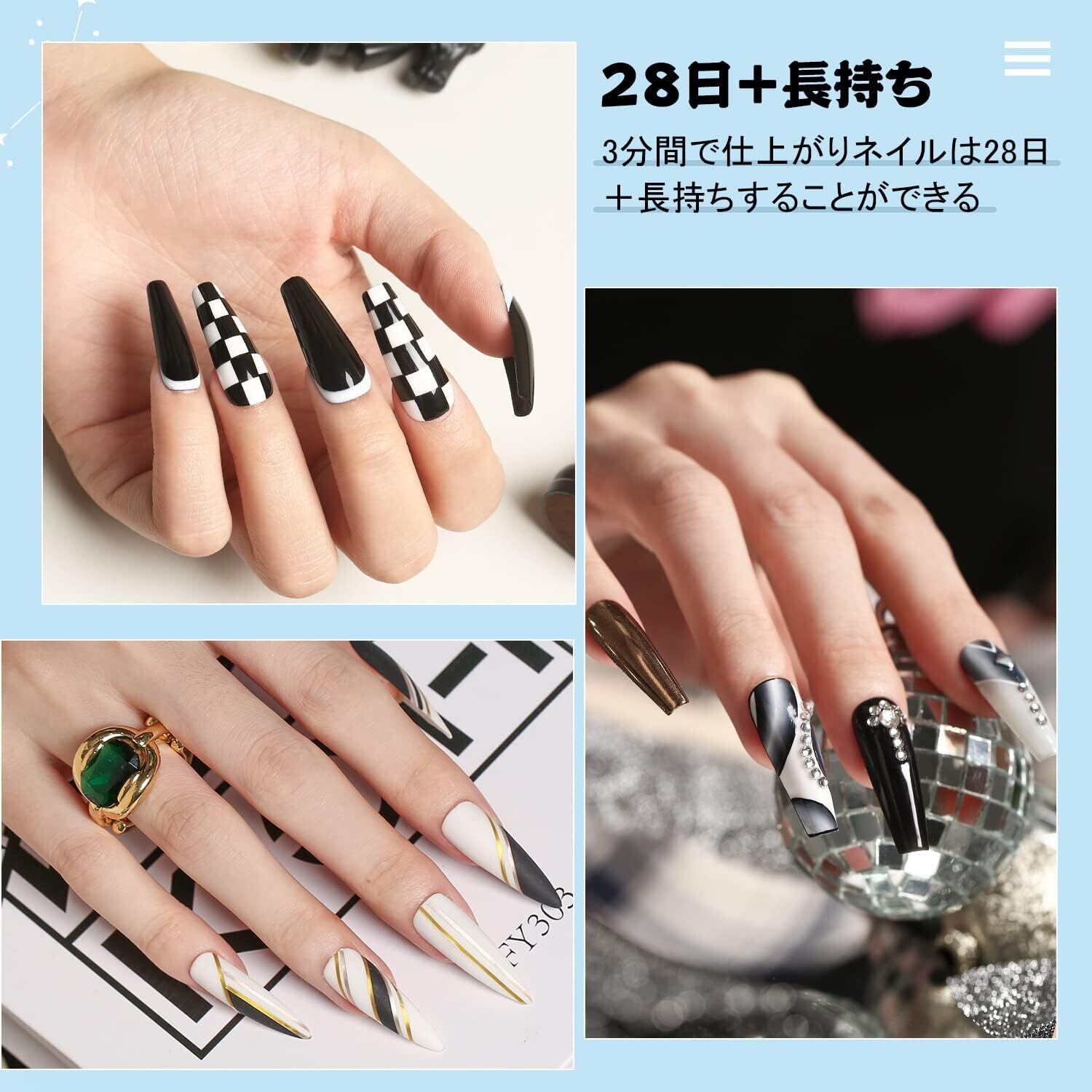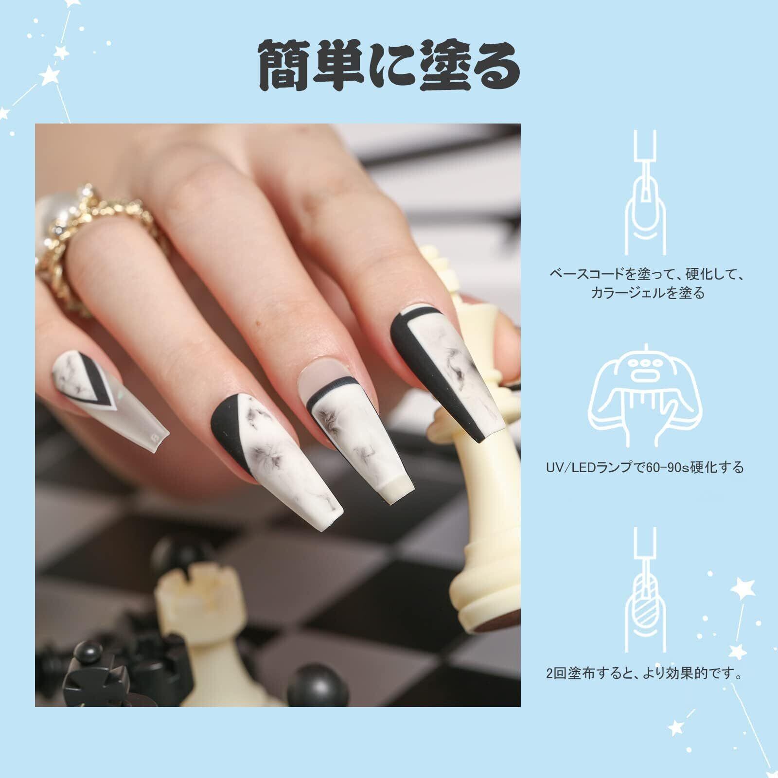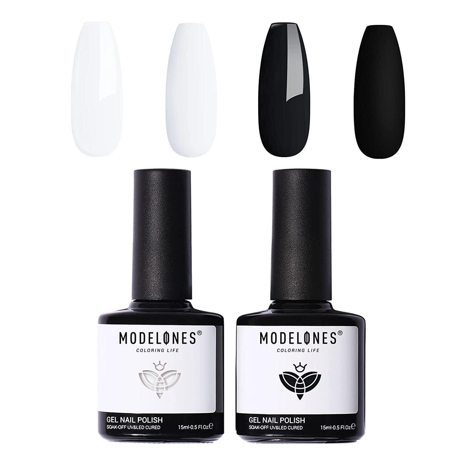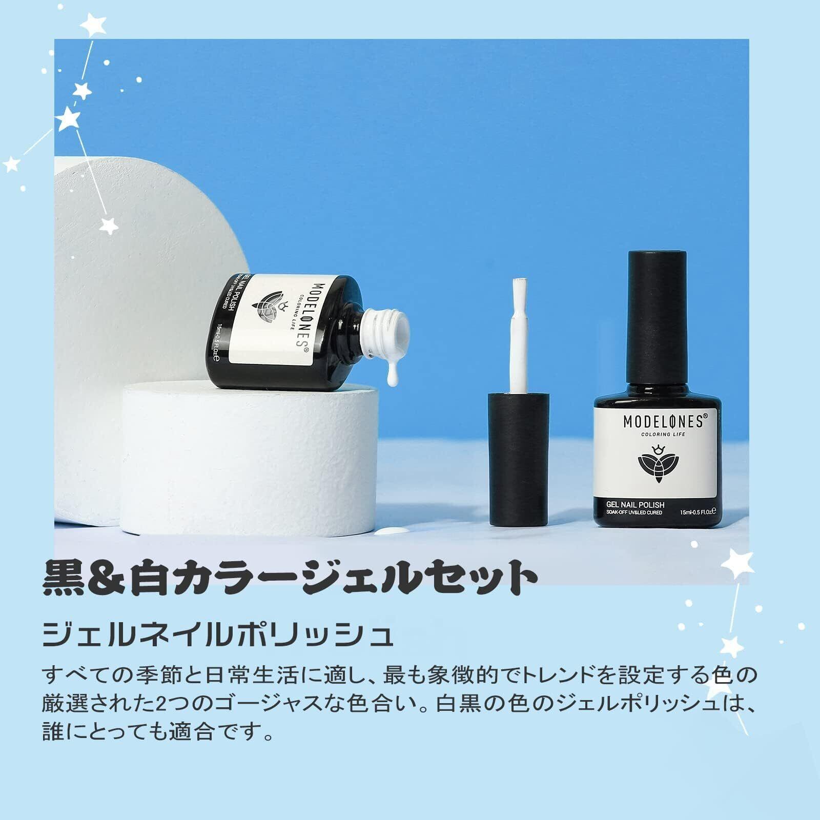 ジェルネイルポリッシュ:Modelones カラーのジェルネイルポリッシュセット:ホワイト、黒のジェルポリッシュ。ネイルランプの下で硬化させる必要があります。 ベースとトップコートが必要です。 ネイルランプの平均60〜120秒