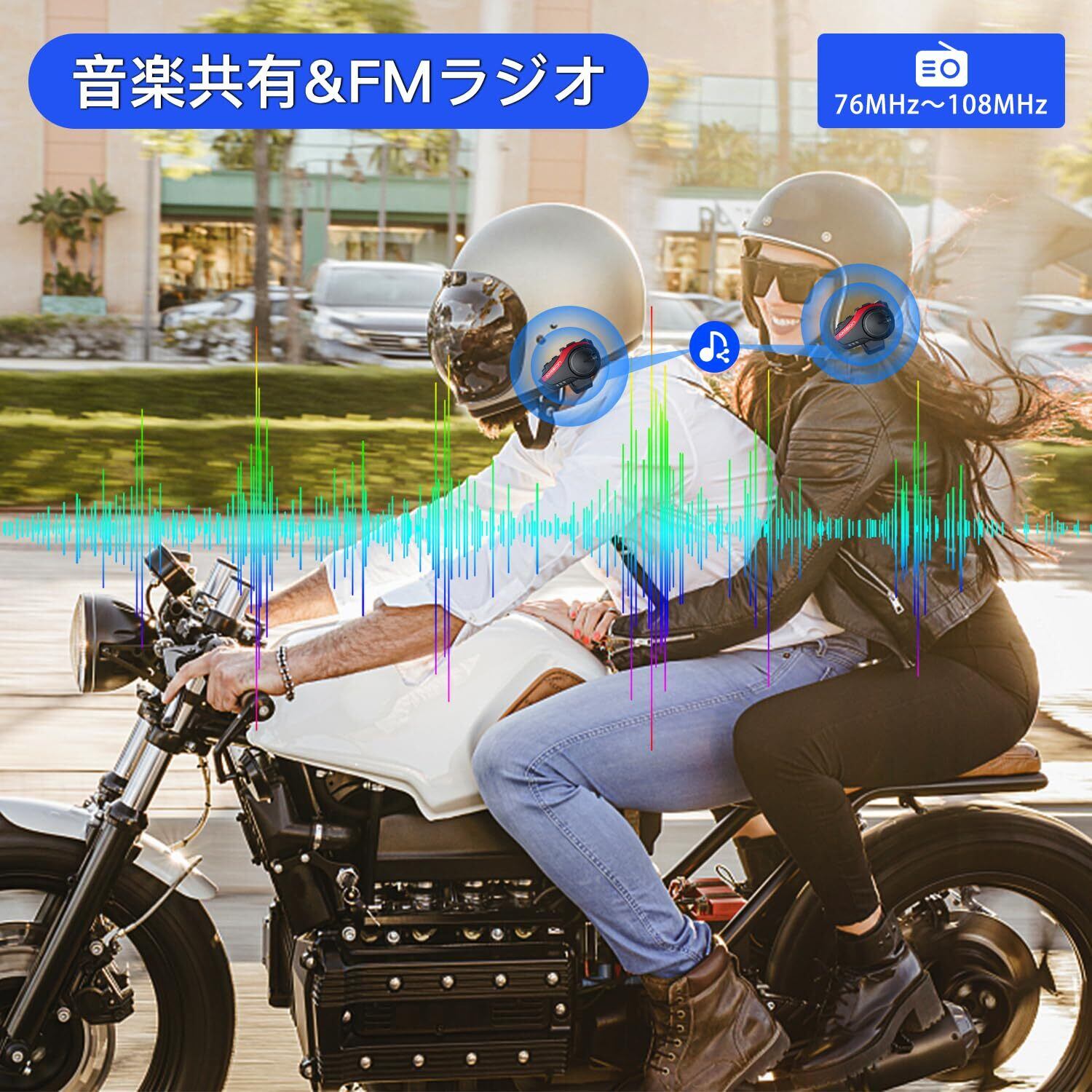 【FMラジオ&音楽共有】本製品にはFMラジオと音楽共有機能を搭載しております。スマホのブルートゥースに接続することによって、音楽再生、ナビゲーション、音声聞き取り、着信応答等の機能を使用できます。本製品は他のブランドのインカムとペアリング可能です。(最大一台まで)