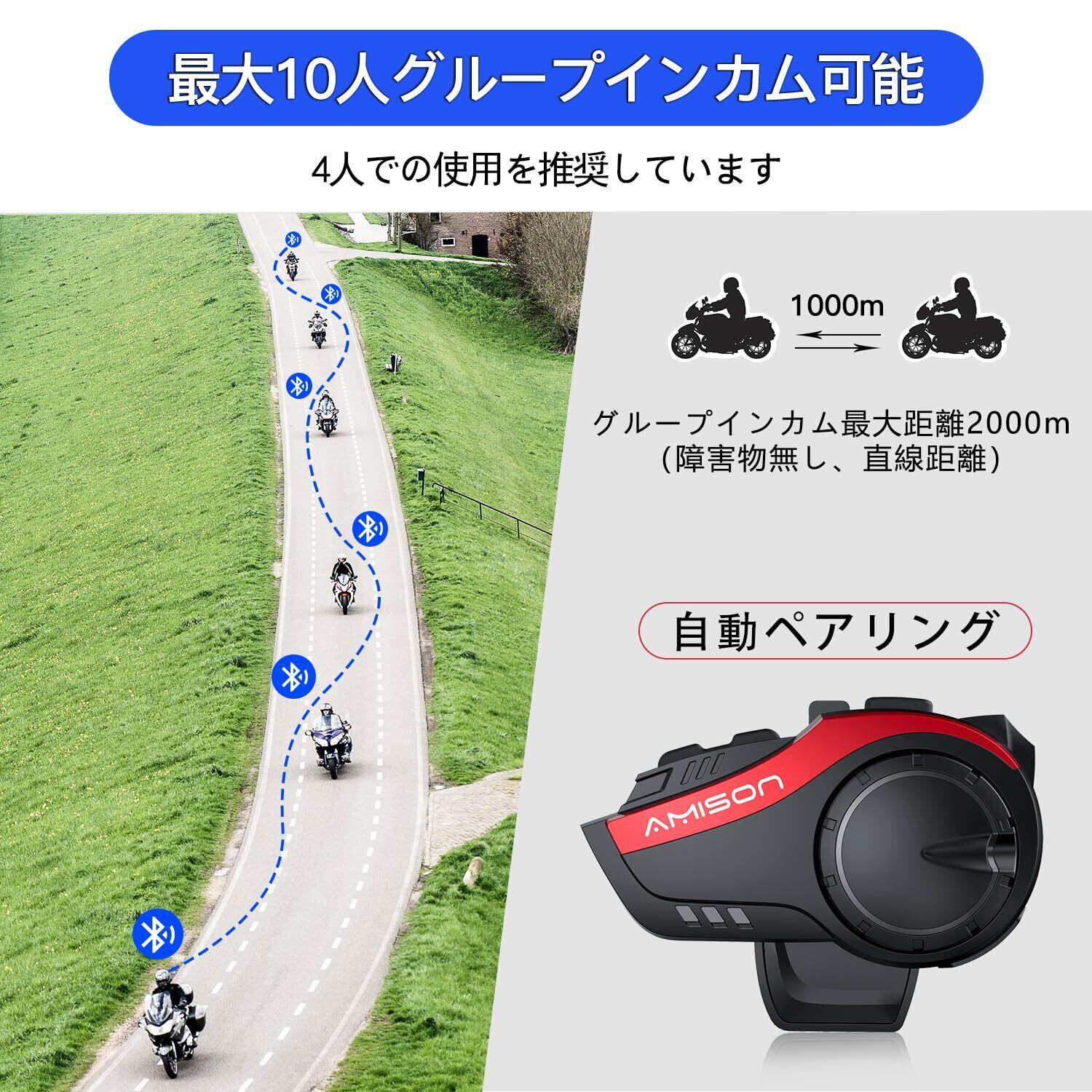 Amison バイクインカム 最大10人同時通話 最大通話距離2000m Bluetooth 5.0 無線機バイクいんかむ 連続28H時間通話 IP67防水 ヘルメット用 音楽共有 音声聞き取リ FMラジオ付きインターコム 自動ペアリング 通信機器 技適認証済み 日本語音声案内 説明書