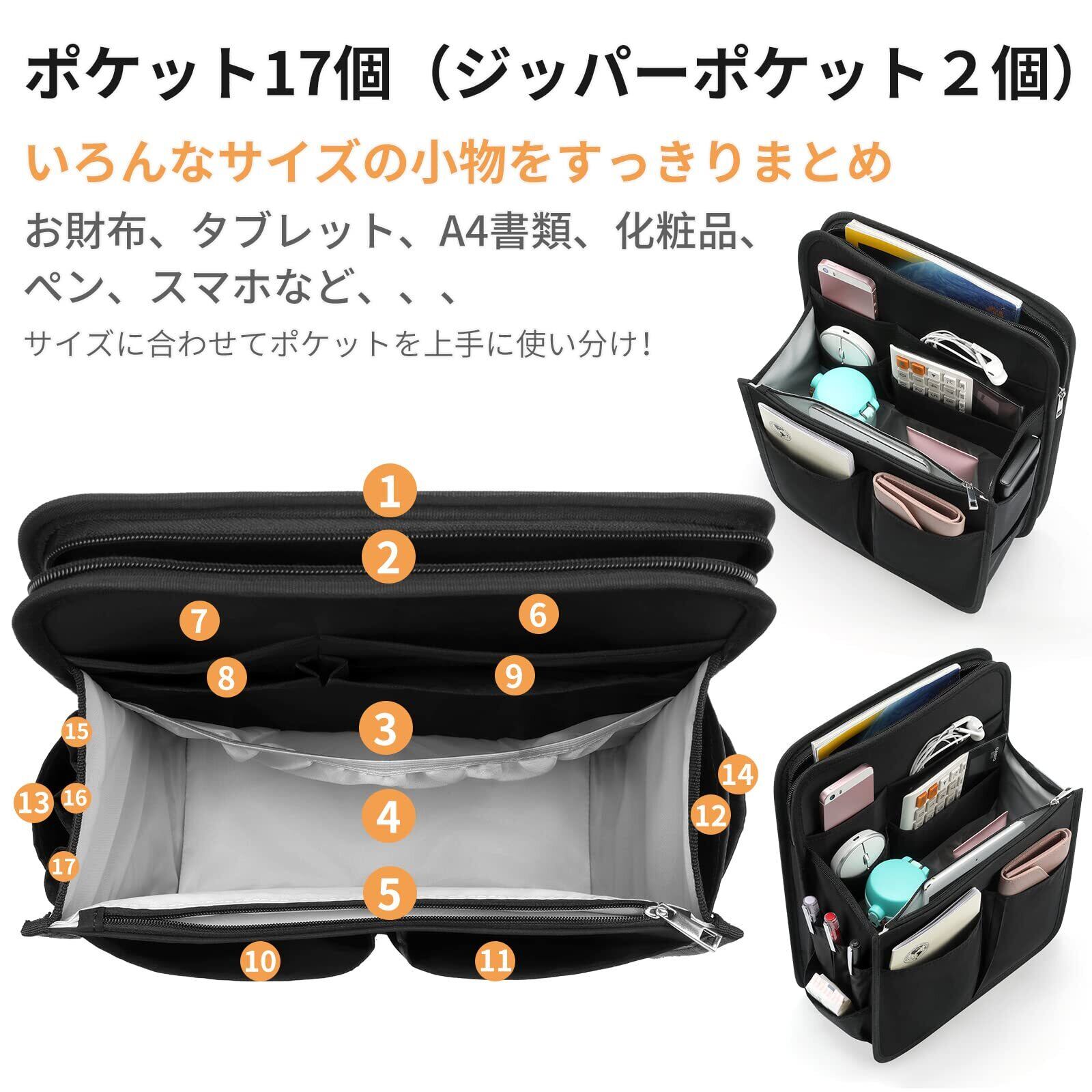 【探しやすく17個機能ポケット】バックインバックは貴重品や化粧品、携帯、長財布、鍵、カードなど、マチあり仕切りで小物を種類別で整理できます。ゴチャゴチャしているバッグの中がすっきりと片付きます。色の浅いインナーで内容物が一目瞭然、取り出し易く使いやすい鞄になります。
