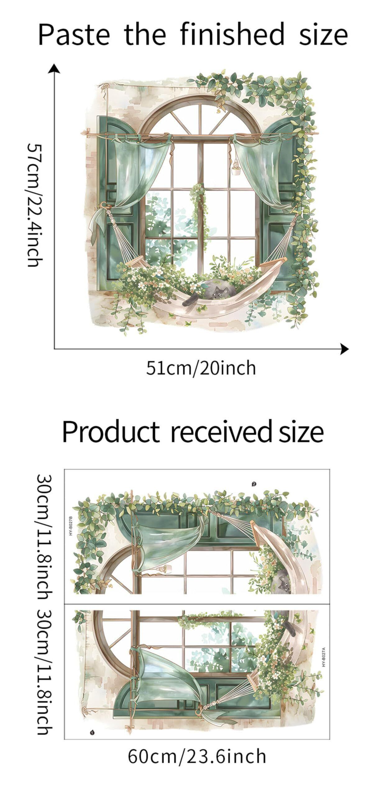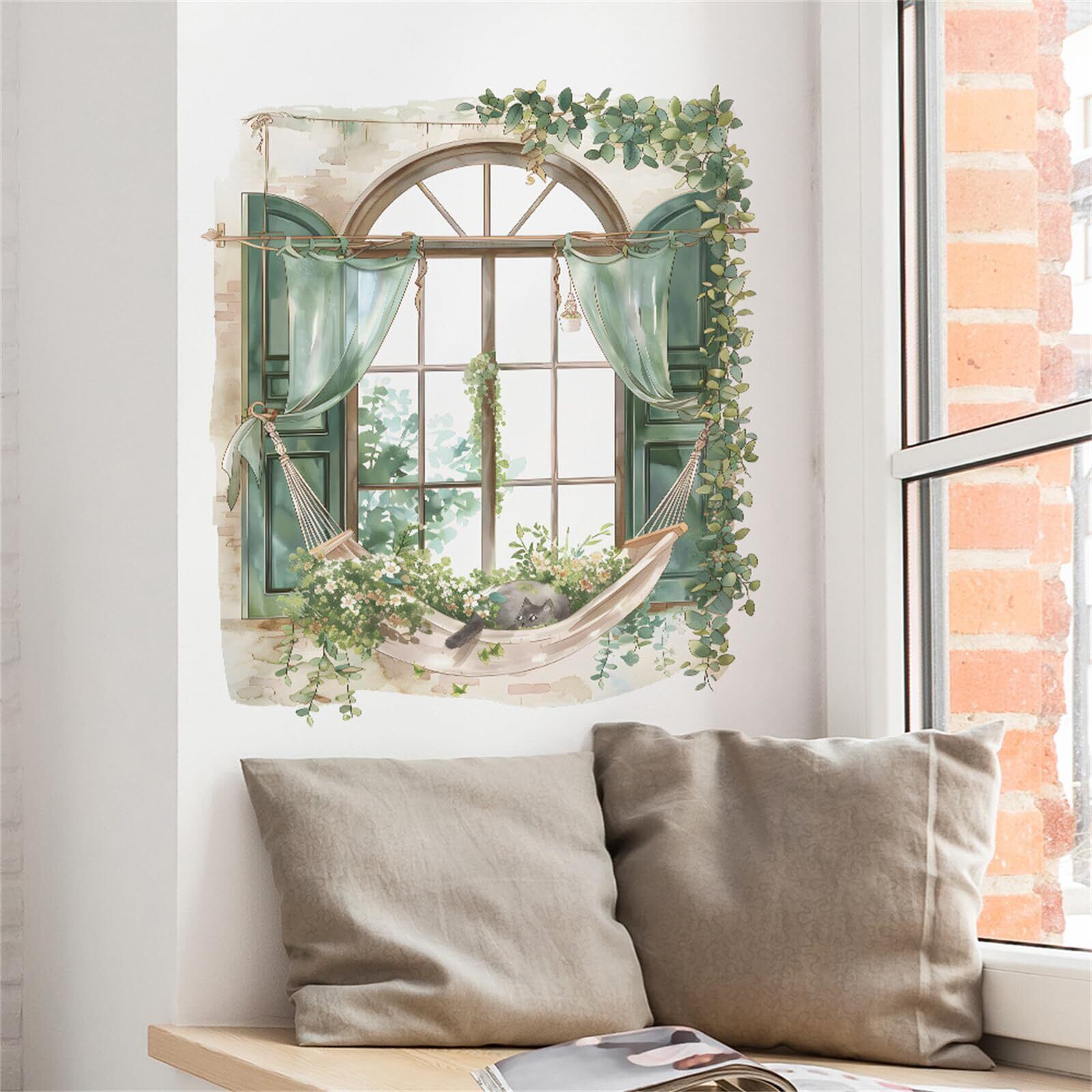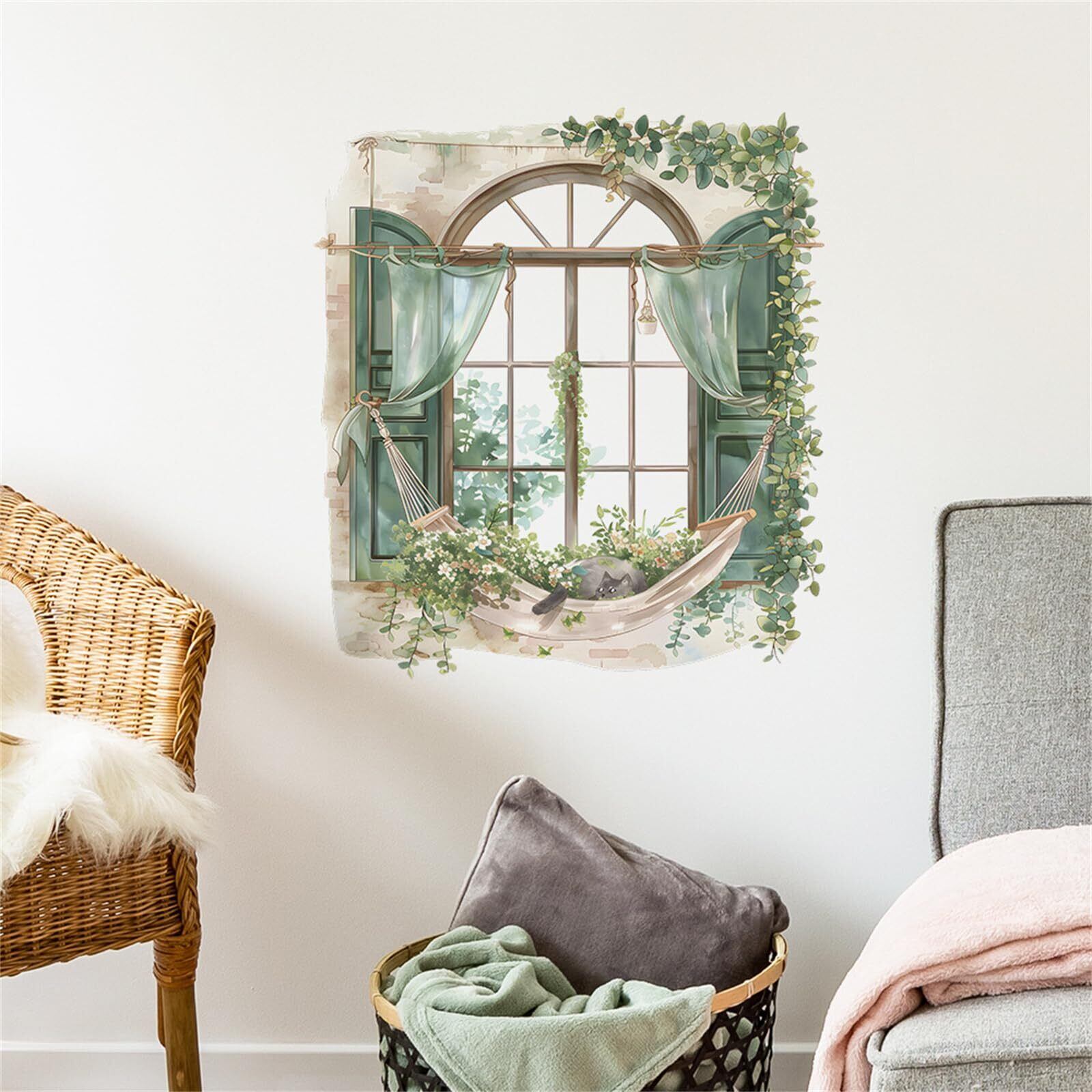ウォールステッカー 偽窓 ステッカー 猫 緑 葉っぱ 花 北欧風 壁紙シール インテリア おしゃれ ステッカー DIY ウォールペーパー 剥がせる PVC素材 生活防水 玄関 リビング ベッドルーム 部屋飾り 壁の装飾 (黒猫)