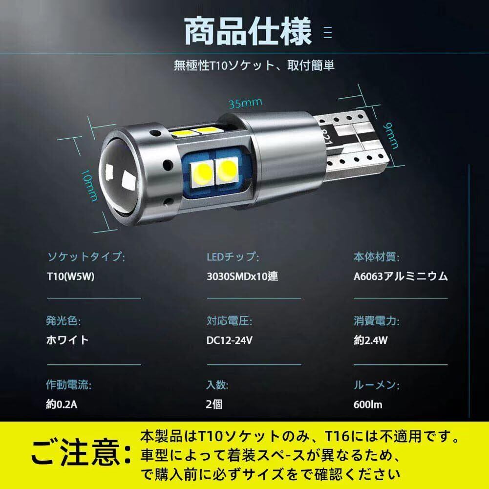 T10 LED ホワイト 爆光 12V 24V ポジションランプ ルームランプ CANBUS キャンセラー内蔵 無極性 レンズ付き 3030 SMD 2.4W 白 2個入 車検対応